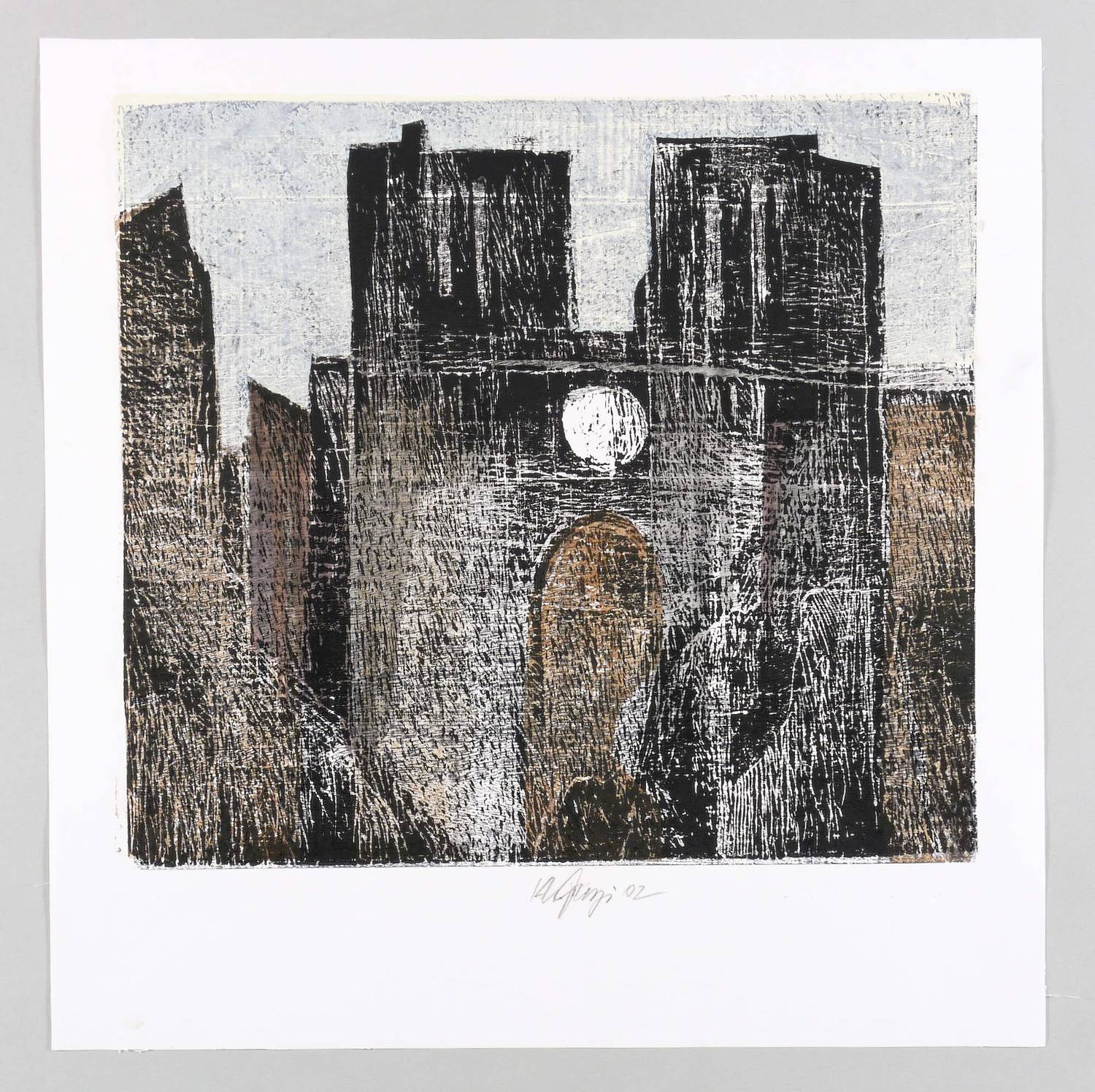 2002. Farbholzschnitt & Materialdruck, in 6 Farben, auf weißem Velin. – Originale Künstlergrafik, von Karlheinz Georgi. – Auflage Exemplar Nr. 1/1 (Unikat). – 38,1 x 42,3 cm (Darstellung / Druckbild), 50 x 50 cm (Blatt).