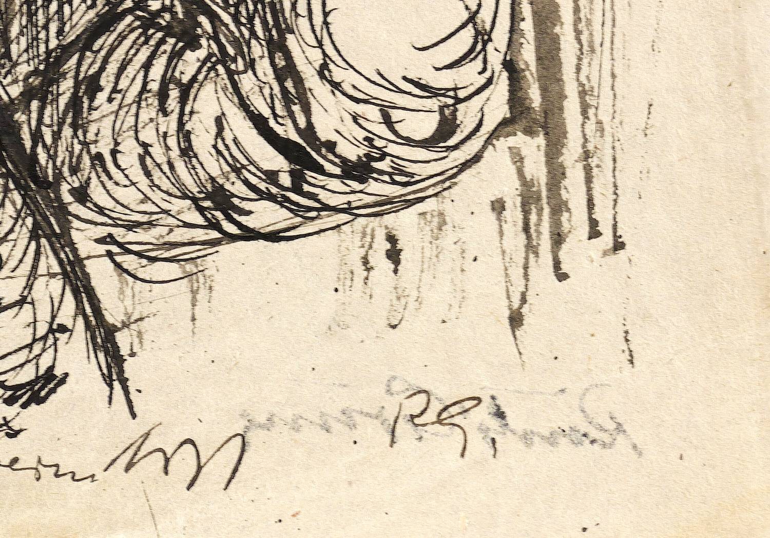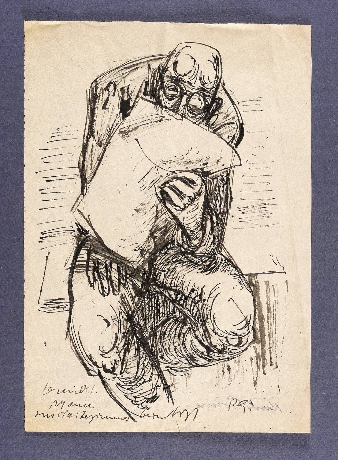 Rechts unten in schwarzer Feder Monogramm. Links bezeichnet. Verso zusätzlich in schwarzer Feder signiert. – Papier stärker knickspurig. Mäßig guter Zustand.