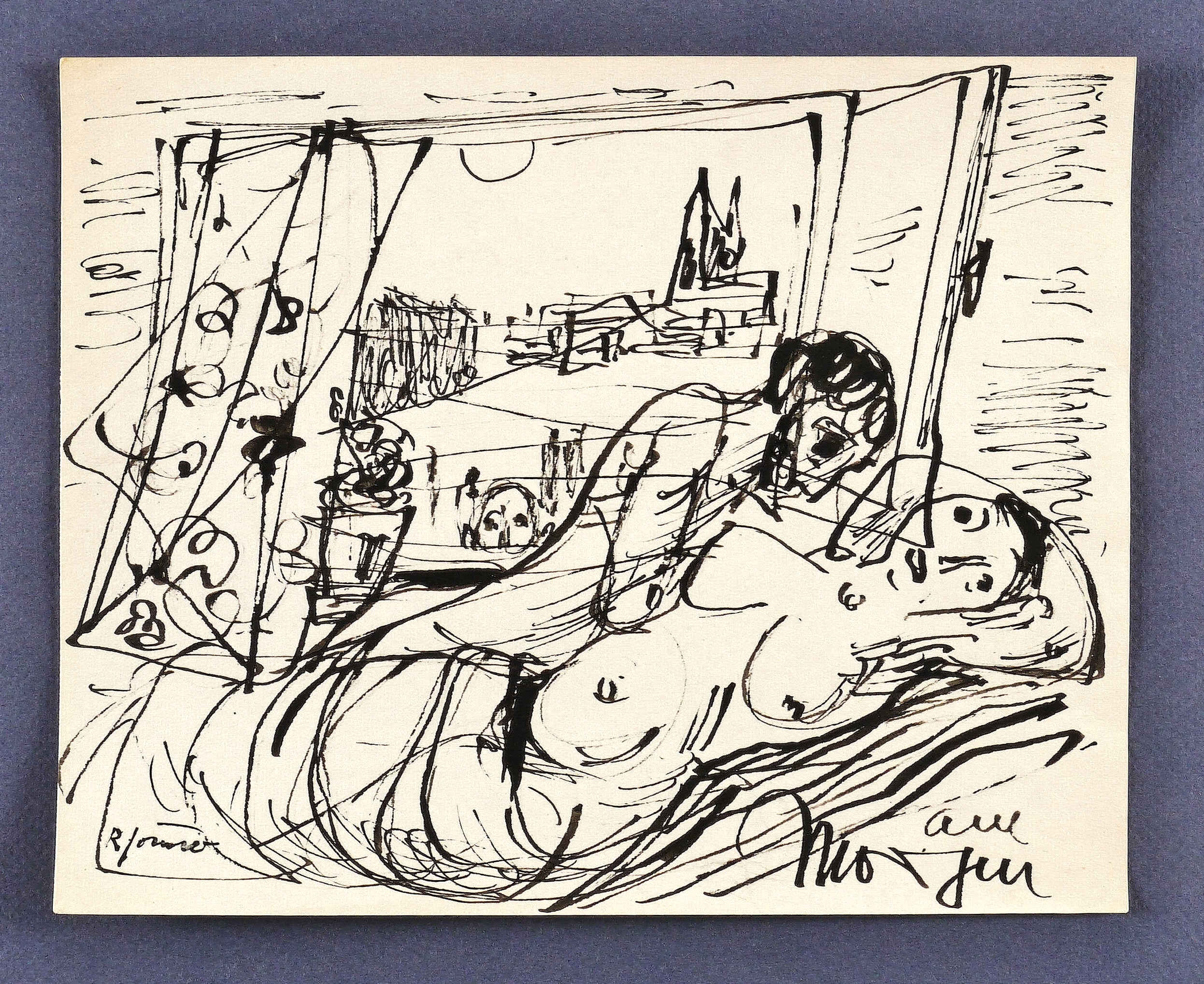 Um 1950. Zeichnung / Federzeichnung, in schwarzer Tusche, auf Papier. – Originale Künstlergrafik, von Rudi Gruner. – Unikat. – 14,8 x 18,5 cm (Darstellung / Blatt).
