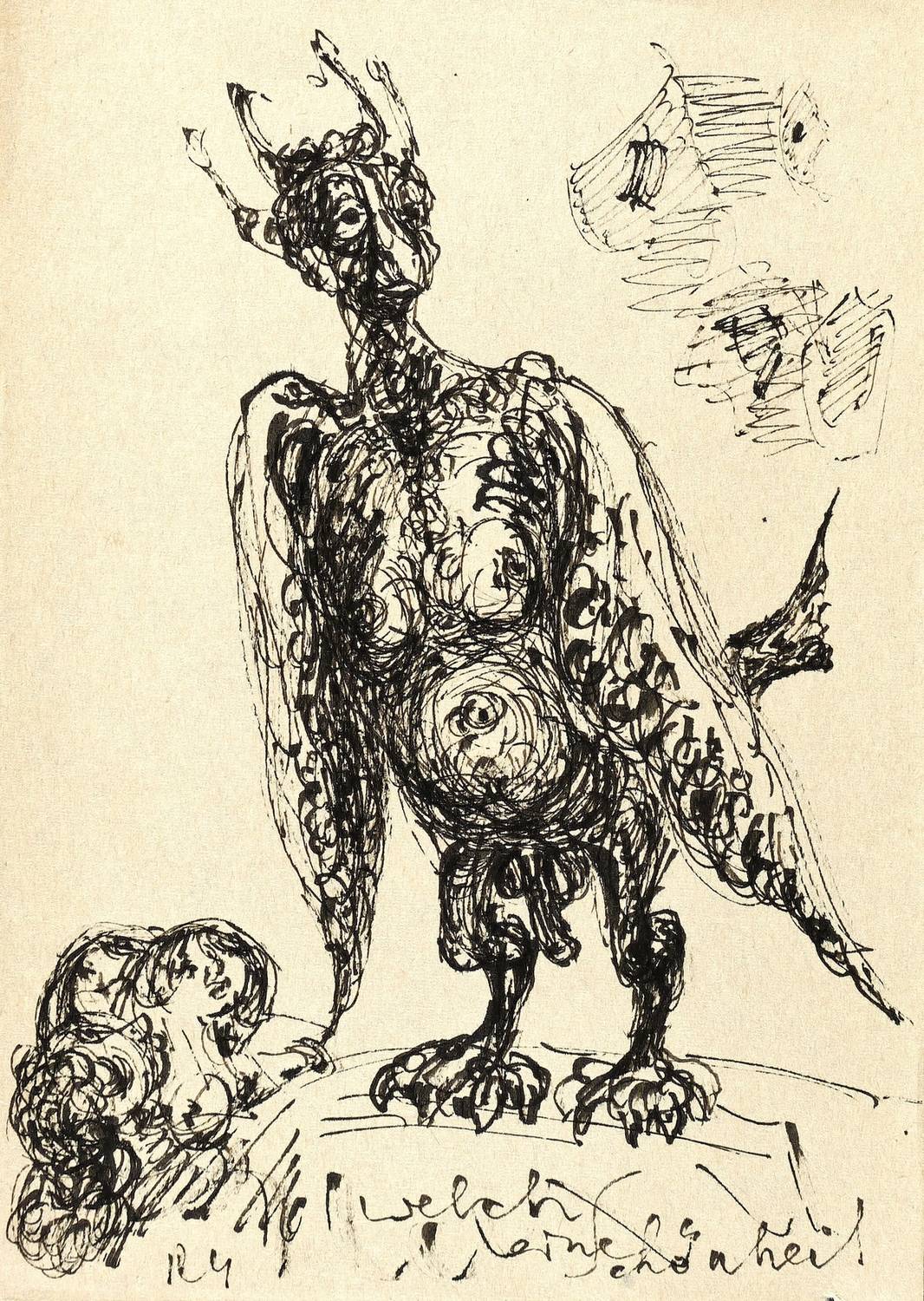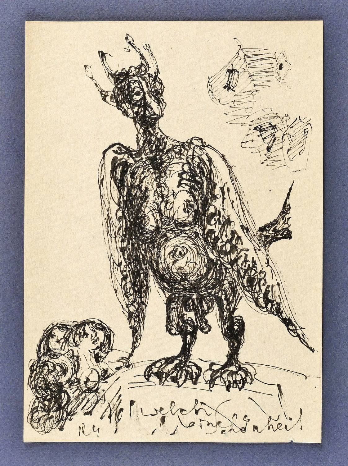 Links unten in schwarzer Feder mit Monogramm signiert. Rechts daneben bezeichnet: ″Welch eine Schönheit″. Verso zusätzlich signiert: ″Rudi Gruner″. – Die satyrhafte Chimäre auf einer bühnenartigen Erhebung, vom Publikum begafft, erinnert an die in Holz geschnittene Titelfigur der Erstausgabe des Simplicissimus von Grimmelshausen. – Guter Zustand.