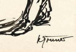1950-1960. Zeichnung / Pinselzeichnung, in schwarzer Tusche, auf Papier. – Originale Künstlergrafik, von Rudi Gruner. – Unikat. – 16,2 x 11,3 cm (Darstellung), 20,5 x 13 cm (Blatt).