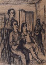 Um 1950. Zeichnung / Kohlezeichnung, partiell gewischt, auf grobem rötlich-braunem Papier. – Originale Künstlergrafik, von Rudi Gruner. – Unikat. – 50,1 x 36,2 cm (Darstellung / Blatt).