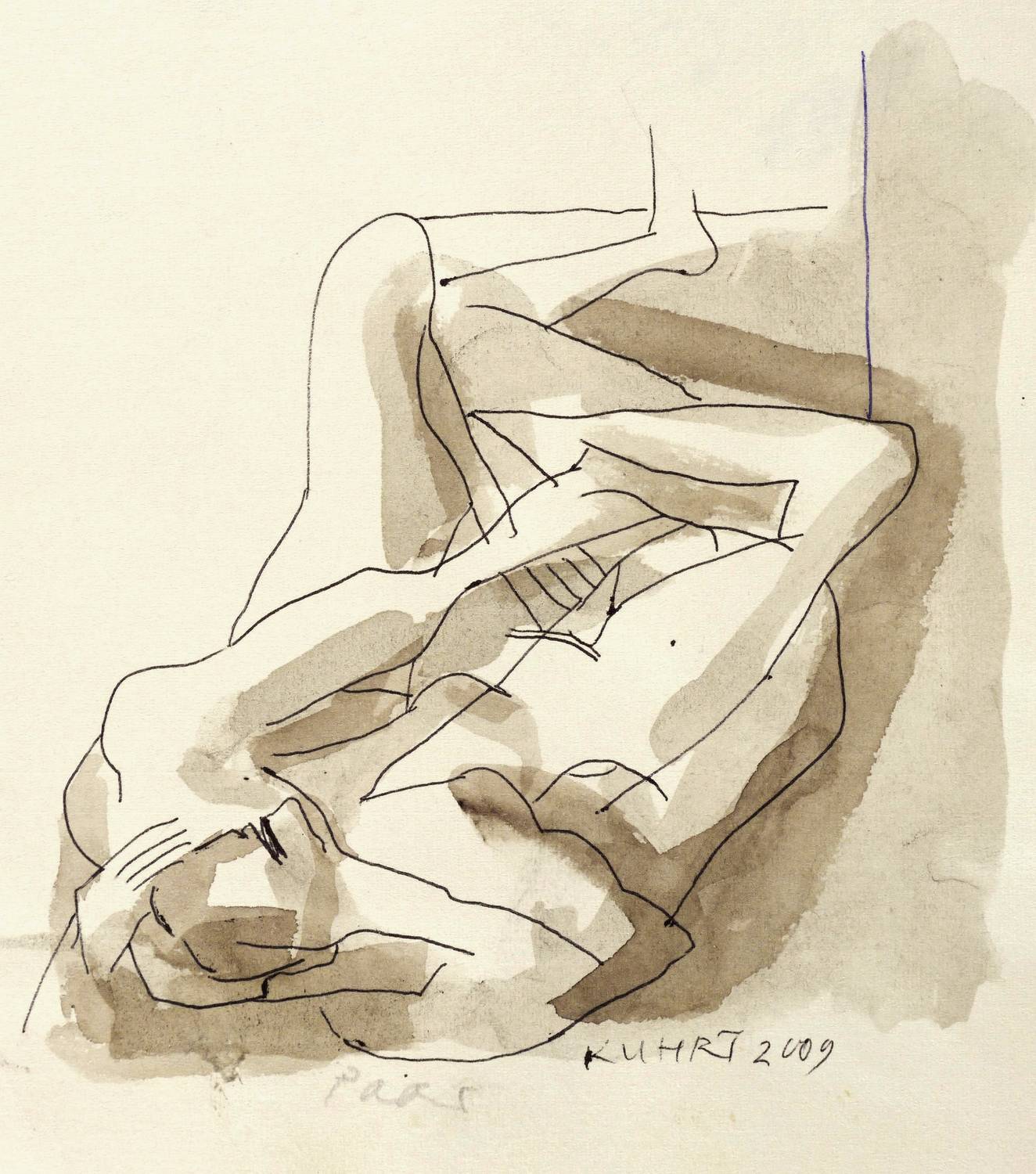 2009. Zeichnung / Kugelschreiber, in Schwarz, in grauer Tusche laviert, auf Maschinenbütten. – Originale Künstlergrafik, von Rolf Kuhrt. – Unikat. – 14,5 x 13,0 cm (Darstellung), 17 x 14,5 cm (Blatt).