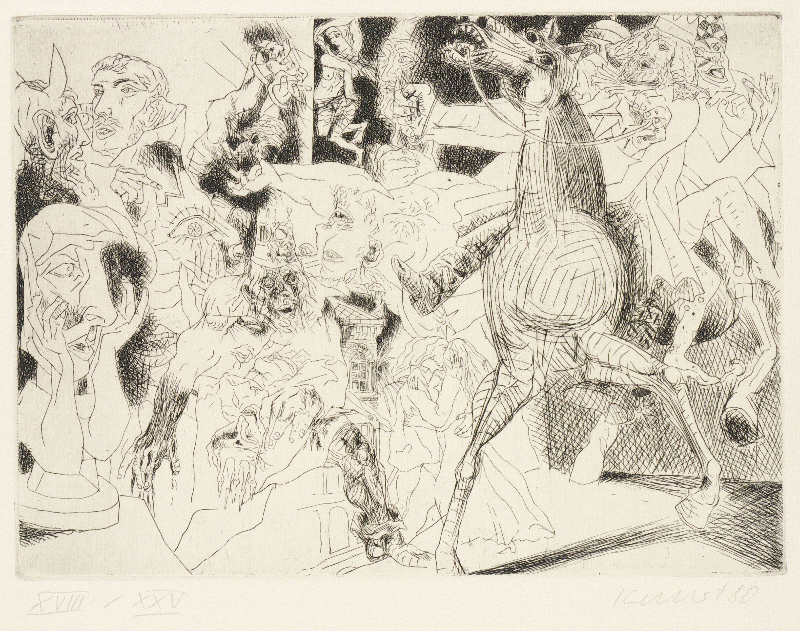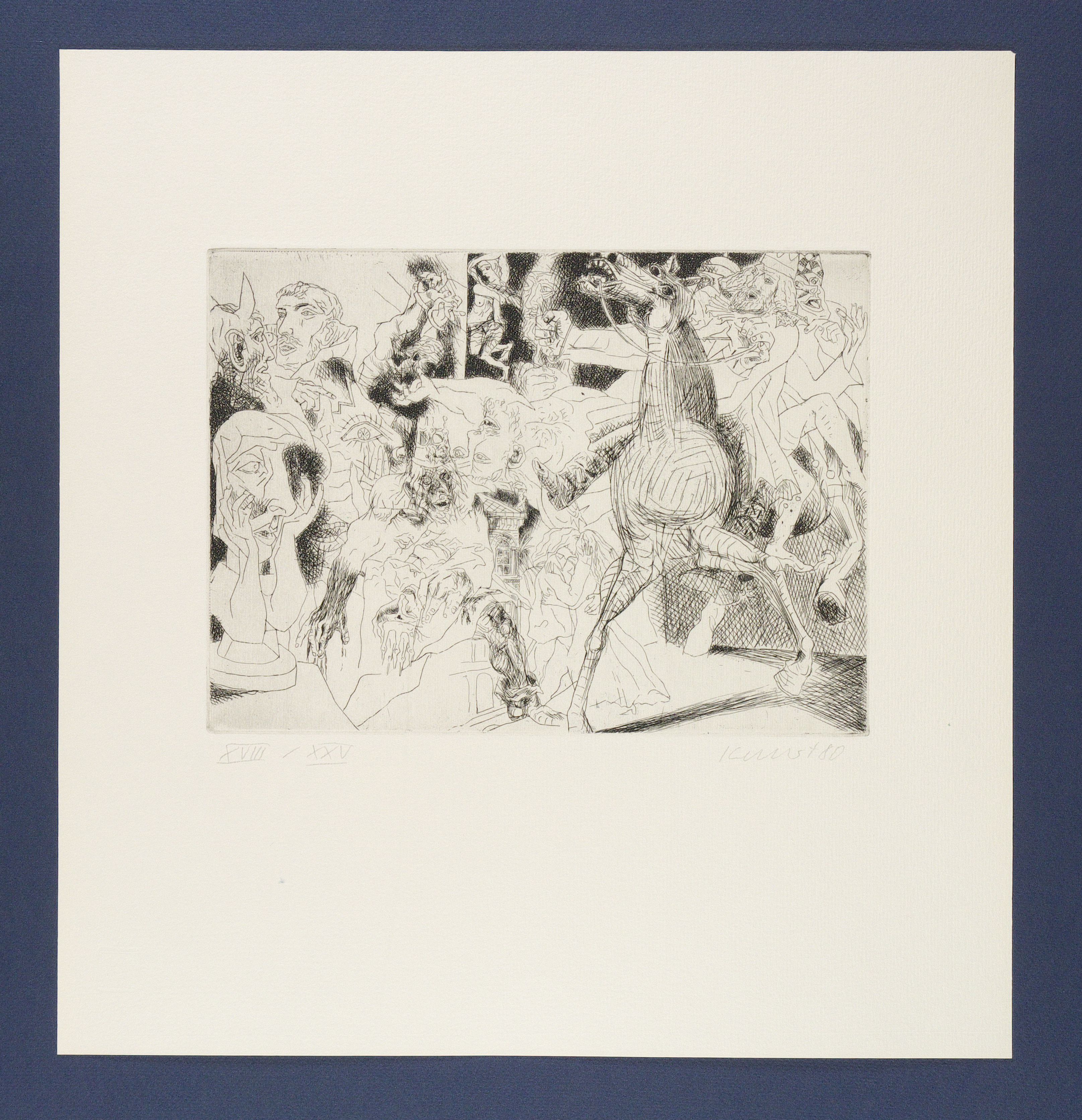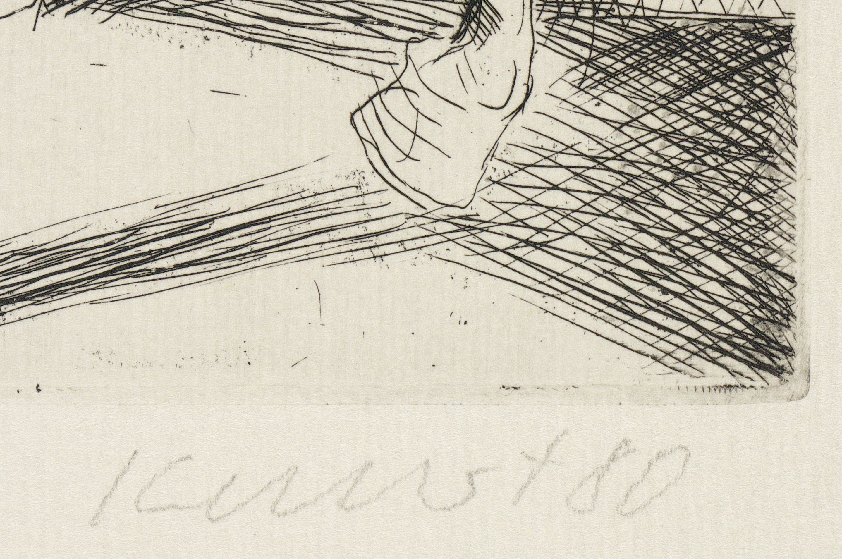 1980. Radierung / Strichätzung, in Schwarz, mit Plattenton, auf hellem Velinkarton. – Originale Künstlergrafik, von Rolf Kuhrt. – Auflage Exemplar Nr. 23/25. – 18,0 x 24,5 cm (Darstellung / Platte), 37 x 35,5 cm (Blatt).