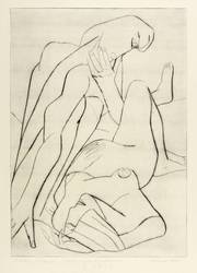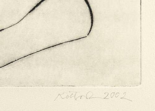 2002. Radierung / Kaltnadelradierung, mit leichtem Plattenton, in Schwarz, auf gelbem Büttenkarton. – Originale Künstlergrafik, von Rolf Kuhrt. – Auflage Exemplar Nr. 3/5. – 49,5 x 35,0 cm (Darstellung / Platte), 62 x 45 cm (Blatt).