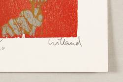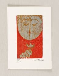 1990-2000. Farboffset, in Gelb, Grau & Rot, auf glattem weißem Postkartenkarton. – Reproduktion, von Detlef Willand. – Auflage Exemplar Nr. 11/30. – 10,4 x 6,2 cm (Darstellung / Druckstock), 15 x 11 cm (Blatt).