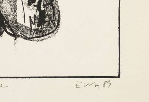 1989. Lithografie / Kreide- & Pinsellithografie, in Schwarz, auf hellchamois Kupferdruck. – Originale Künstlergrafik, von Erich-Wolfgang Hartzsch. – Künstlerexemplar (e.a.). – 30,1 x 23,7 cm (Darstellung / Druckbild), 36 x 30 cm (Blatt).