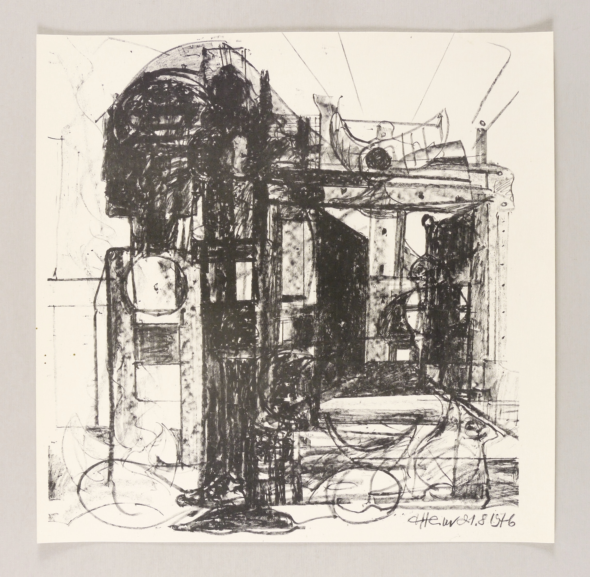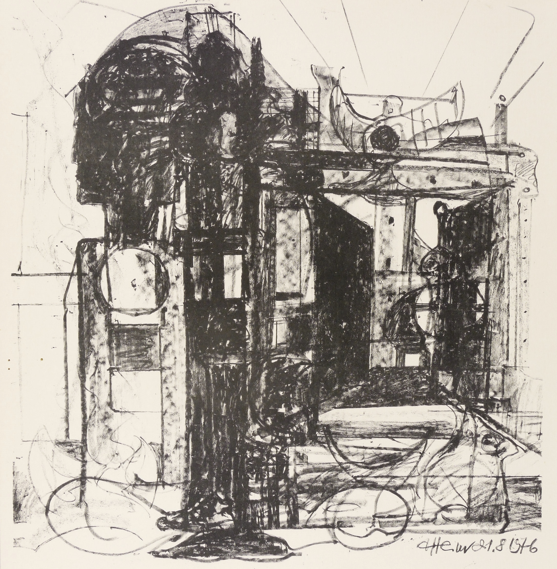 1976. Lithografie / Fotolithografie, in Schwarz, auf geleimtem hellchamois Velin. – Originale Künstlergrafik, von Achim Heim. – 35,5 x 33,4 cm (Darstellung / Druckbild), 37 x 37 cm (Blatt).