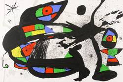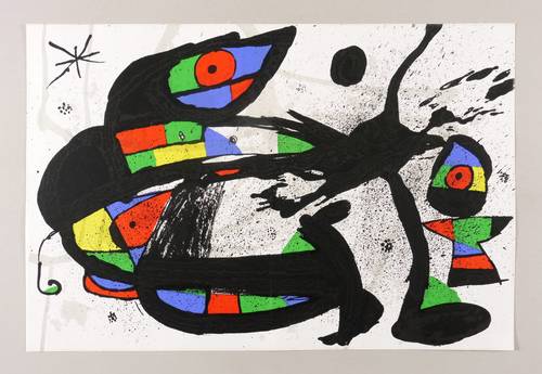 1978. Farblithografie / Pinsellithografie, partiell gespritzt, in 6 Farben, auf glattem weißem Werkdruck. – Originale Künstlergrafik, von Joan Miro. – 37,8 x 56,4 cm (Darstellung / Blatt).