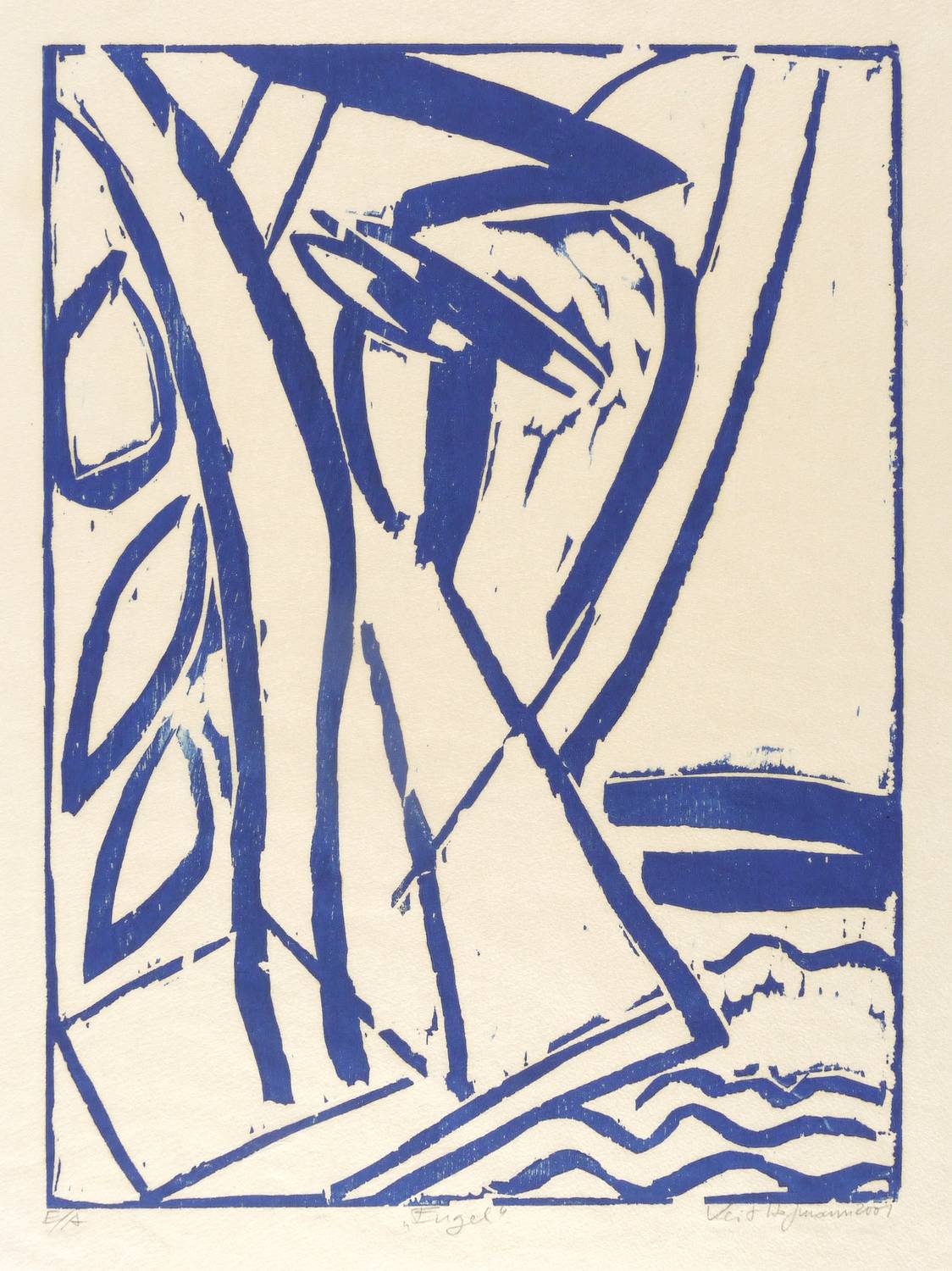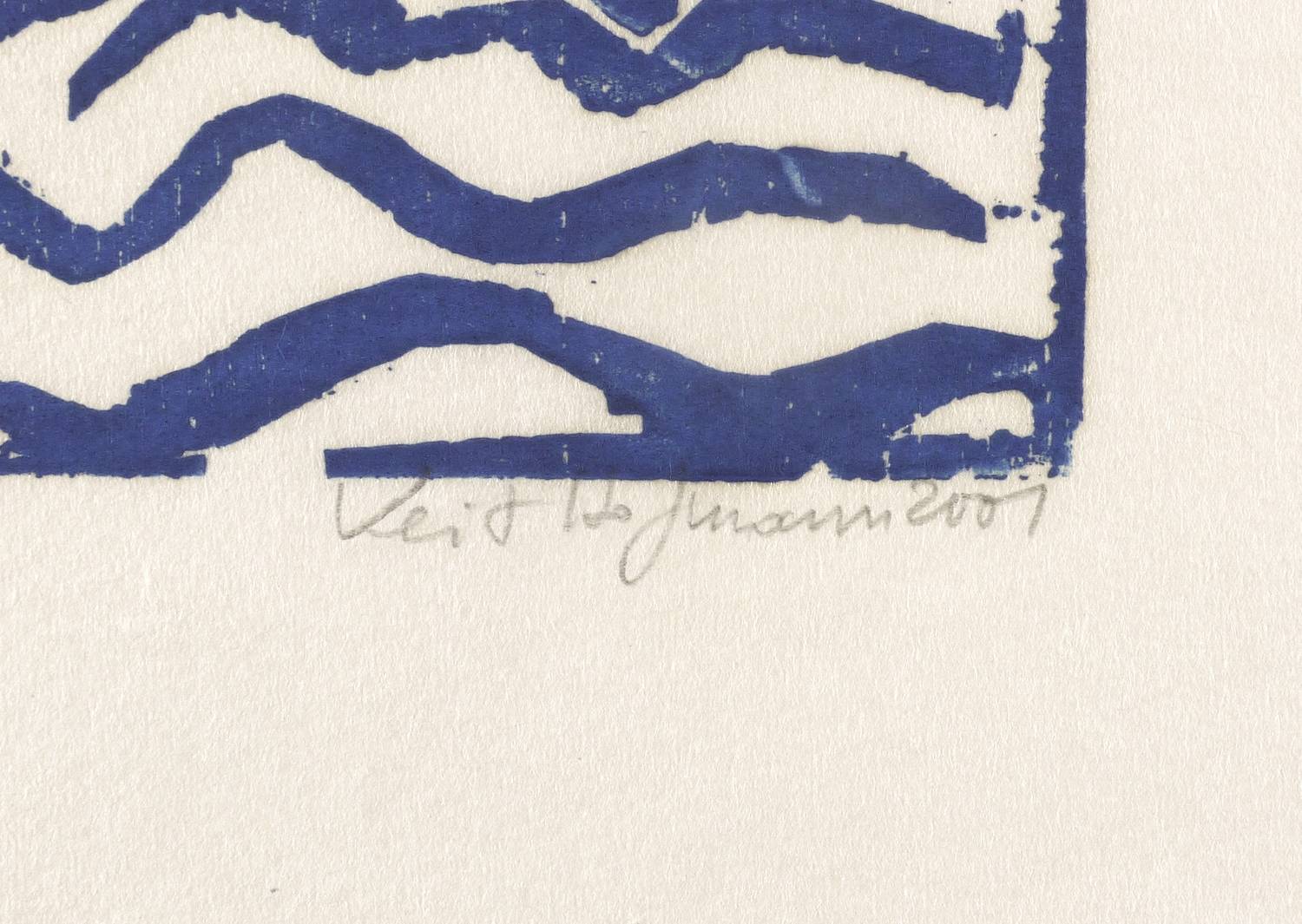 2001. Holzschnitt, in Dunkelblau, auf rauem weißlichem Simili-Japan. – Originale Künstlergrafik, von Veit Hofmann. – Künstlerexemplar (e.a.). – 40,2 x 29,8 cm (Darstellung / Druckstock), 51 x 40 cm (Blatt).