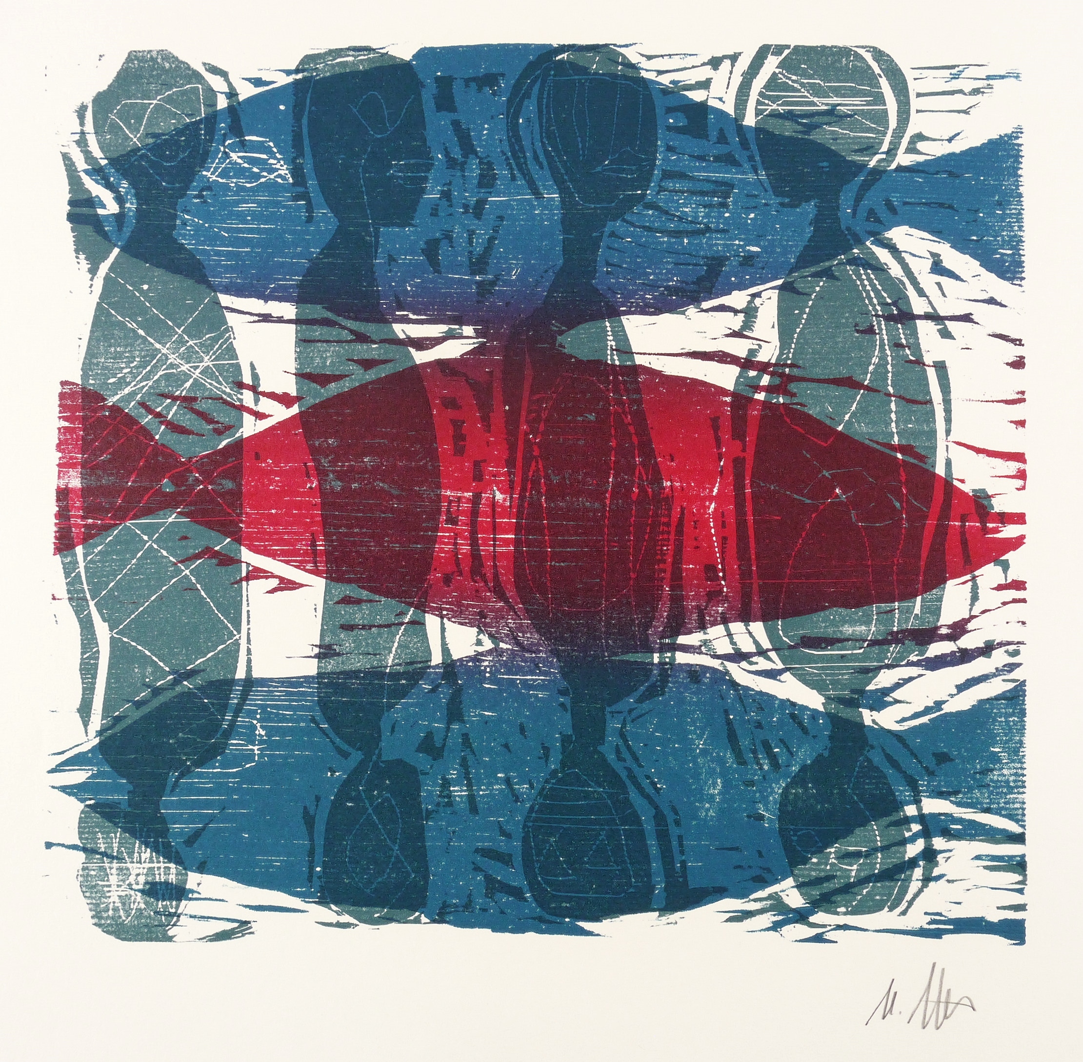 1995. Farbholzschnitt, in 3 Farben, auf hellchamois Werkdruck. – Originale Künstlergrafik, von Michael Arantes-Müller. – 34,5 x 37,2 cm (Darstellung / Druckstock), 44 x 57 cm (Blatt).