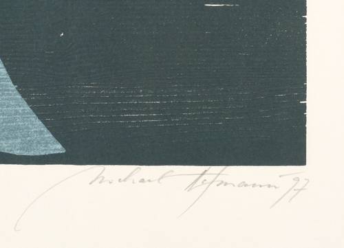 1997. Farbholzschnitt, in 5 Farben, mit Irisdruck, auf weißem Werkdruck. – Originale Künstlergrafik, von Michael Hofmann. – 39,7 x 49,1 cm (Darstellung / Druckbild), 49 x 56 cm (Blatt).