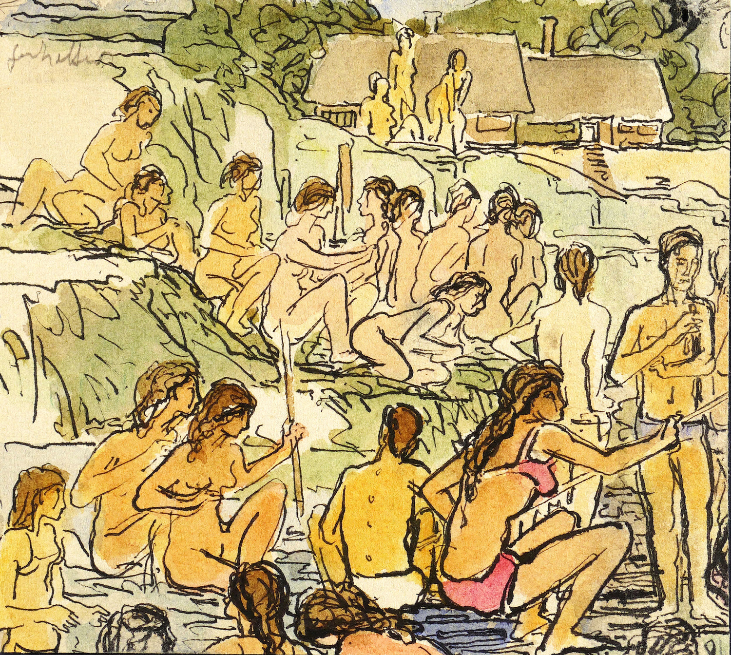 1980. Aquarell, über Tusche, auf hellgelbem Büttenpapier. – Originale Künstlergrafik, von Gerhard Kettner. – Unikat. – 12,8 x 14,2 cm (Darstellung / Blatt).