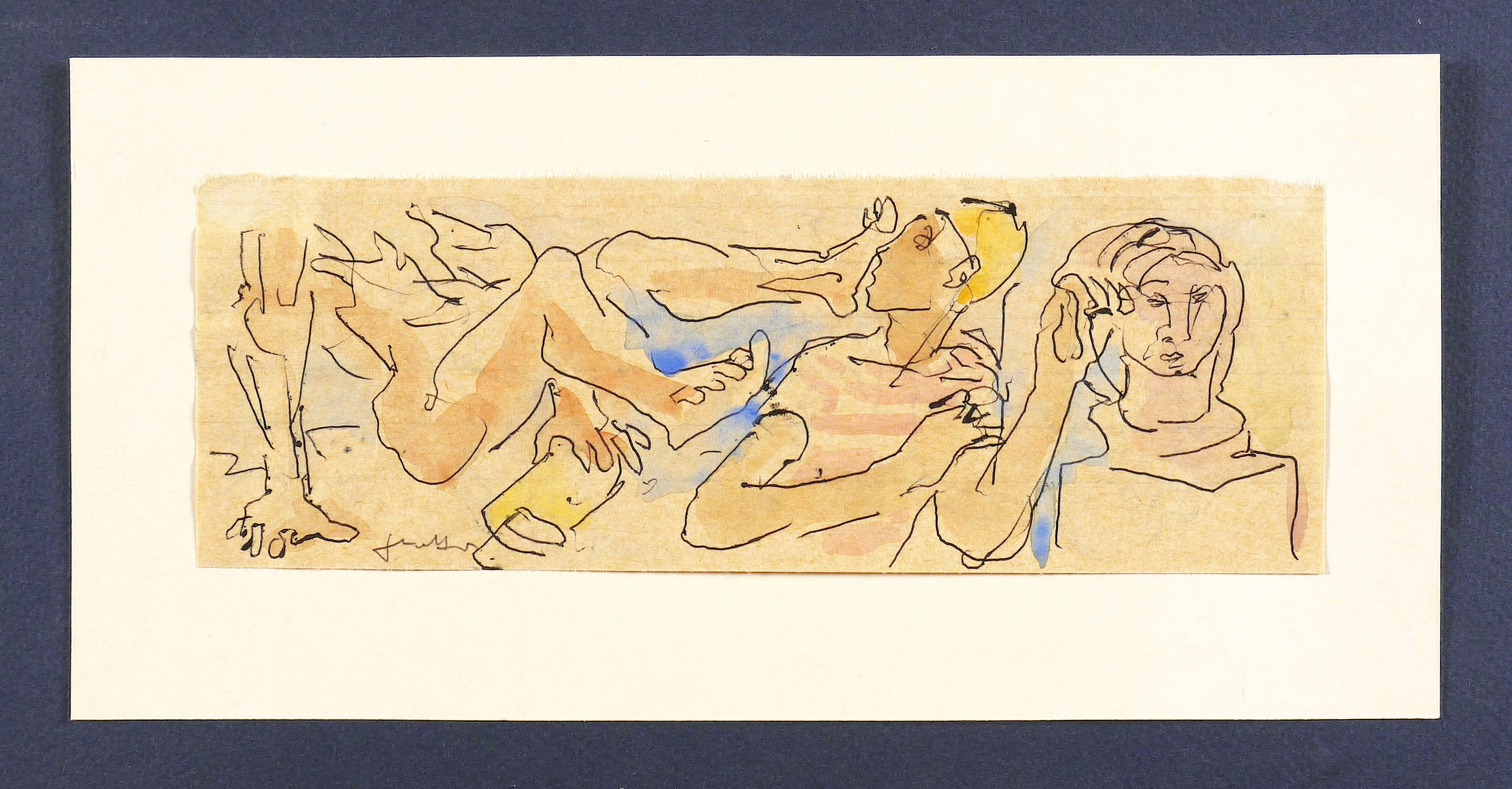 Um 1980. Zeichnung / Kugelschreiber, aquarelliert, auf liniertem Papier. – Originale Künstlergrafik, von Gerhard Kettner. – Unikat. – 7,2 x 20,5 cm (Darstellung / Blatt), 12,5 x 25 cm (Trägerkarton).