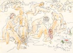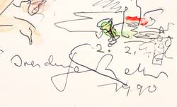 1990. Zeichnung / Kugelschreiber, aquarelliert, auf glattem weißem Papier. – Originale Künstlergrafik, von Gerhard Kettner. – Unikat. – 17,8 x 24,0 cm (Darstellung / Blatt), 20 x 27 cm (Trägerkarton).