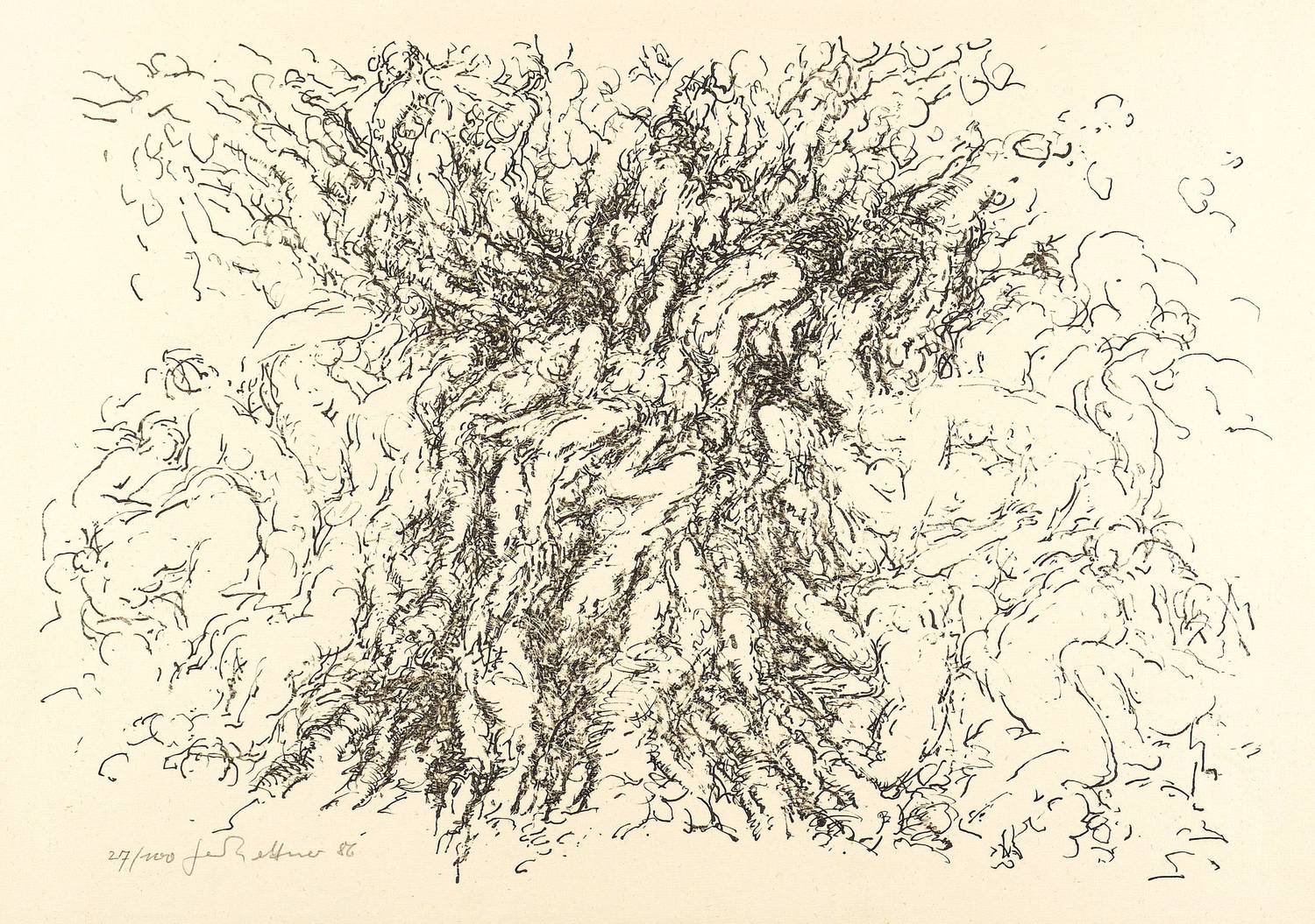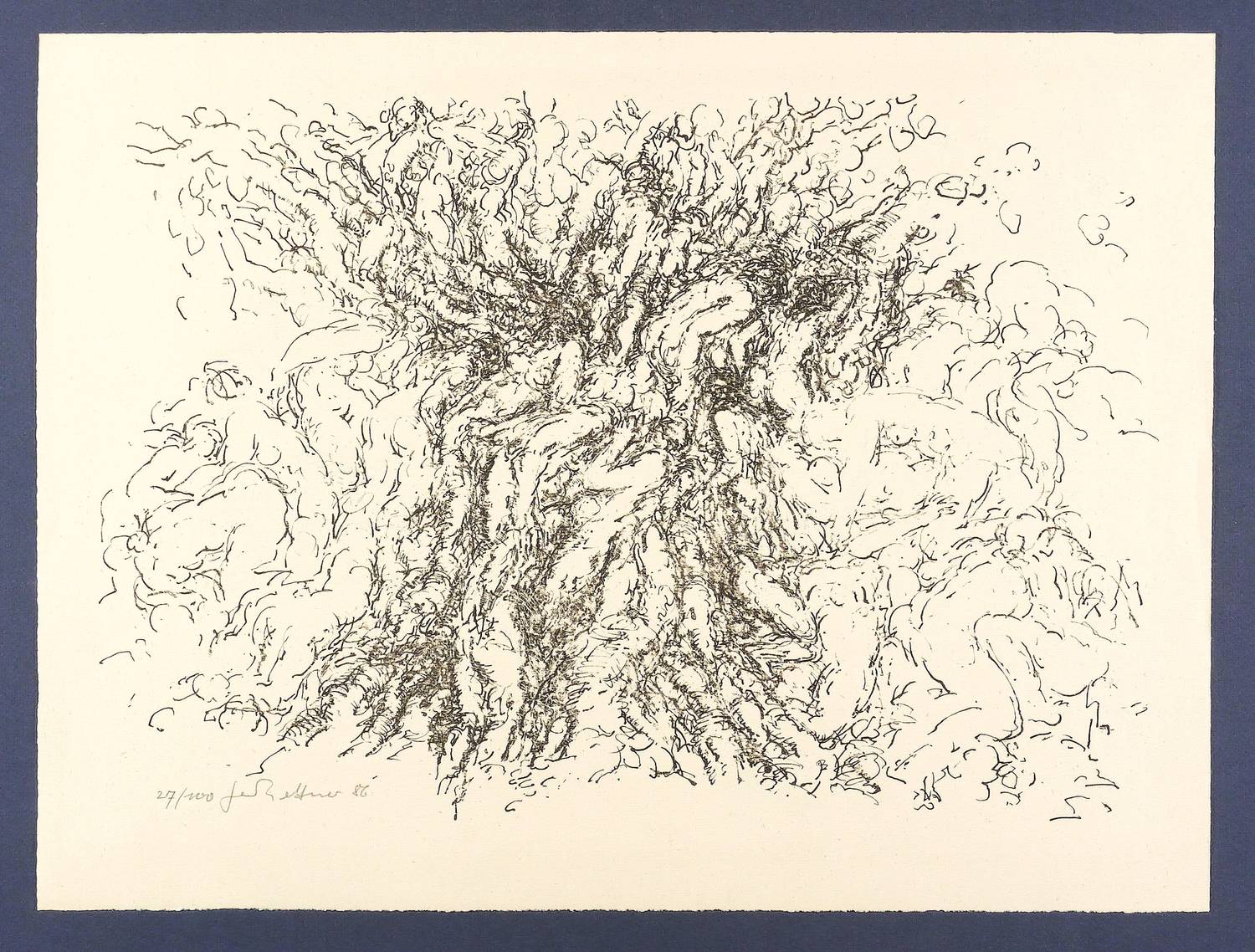 Links unten in Bleistift signiert und datiert. Dazu Auflagenbezeichnung. – Originalgrafik zu dem Gedicht ″Liebesbaum″ von Hanns Cibulka. – Blattkanten minimal knickspurig. Verso Montagespuren. Guter Zustand.