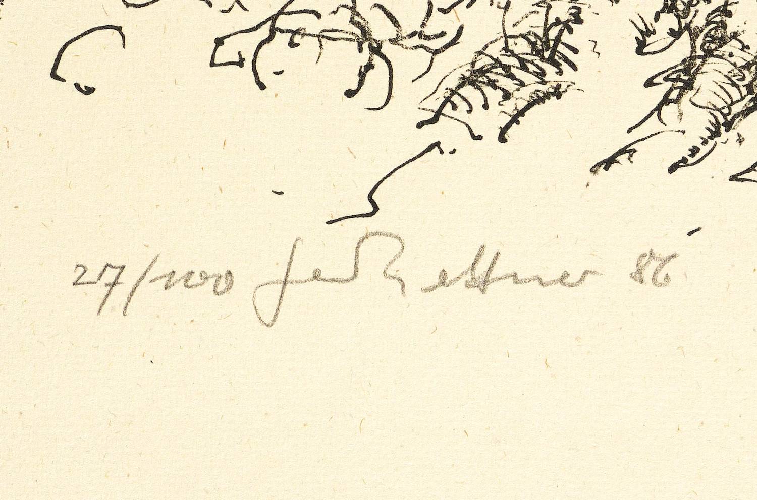 1986. Lithografie / Federlithografie, partiell geschabt, in Schwarz, auf gelblichem Büttenkarton. – Originale Künstlergrafik, von Gerhard Kettner. – Auflage Exemplar Nr. 27/100. – 32,5 x 46,6 cm (Darstellung / Druckbild), 39 x 52,5 cm (Blatt).