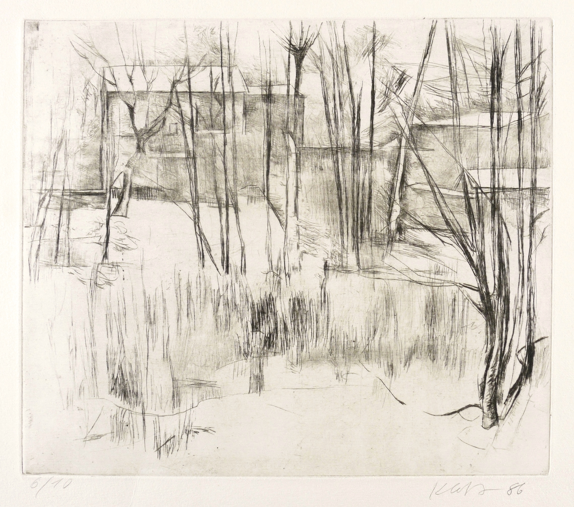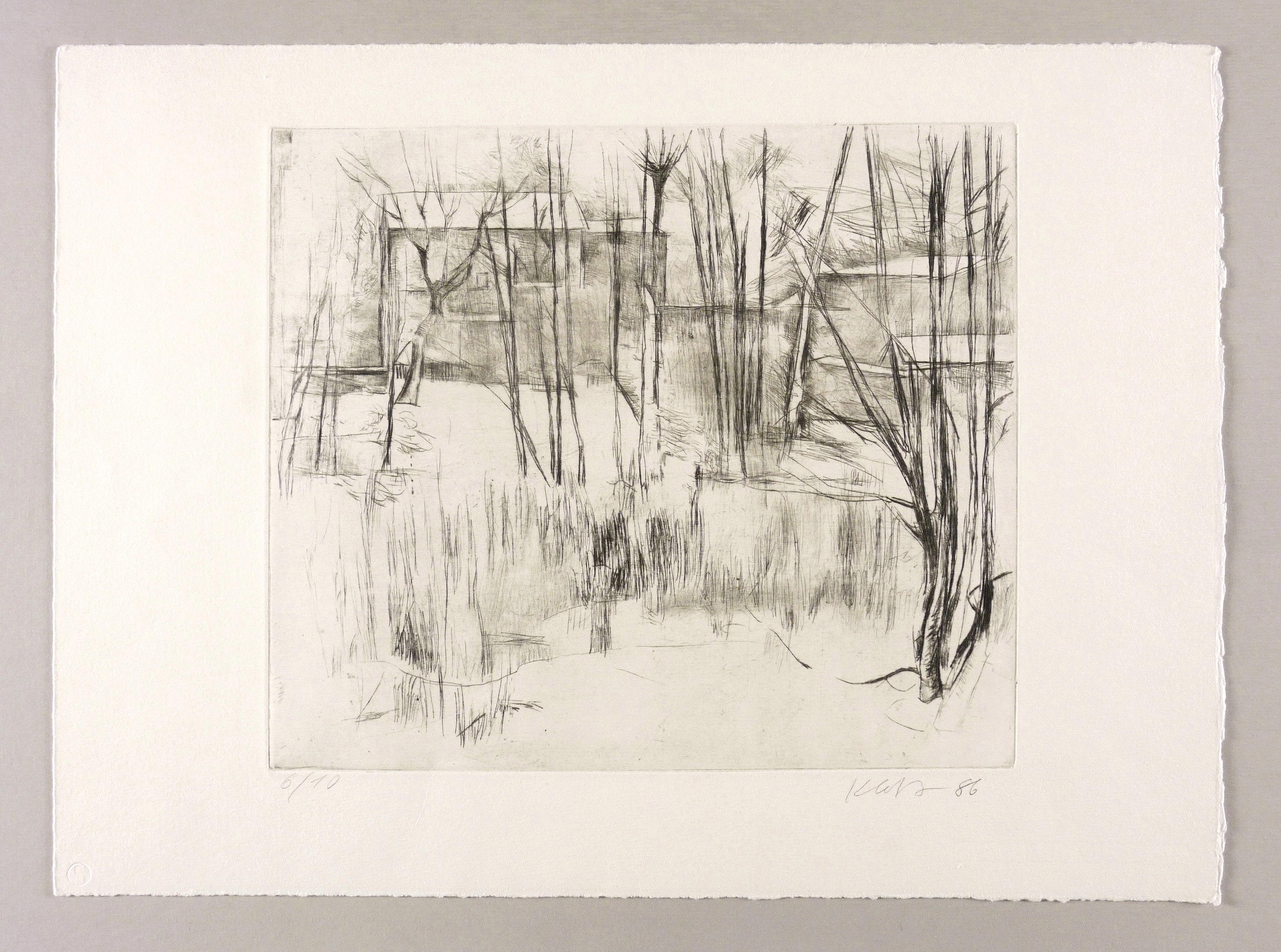 1970/1986. Radierung / Kaltnadel, mit leichtem Plattenton, in Schwarz, auf hellchamois Hahnemühle. – Originale Künstlergrafik, von Siegfried Klotz. – Auflage Exemplar Nr. 6/10. – 29,9 x 34,5 cm (Darstellung / Platte), 39 x 54 cm (Blatt).