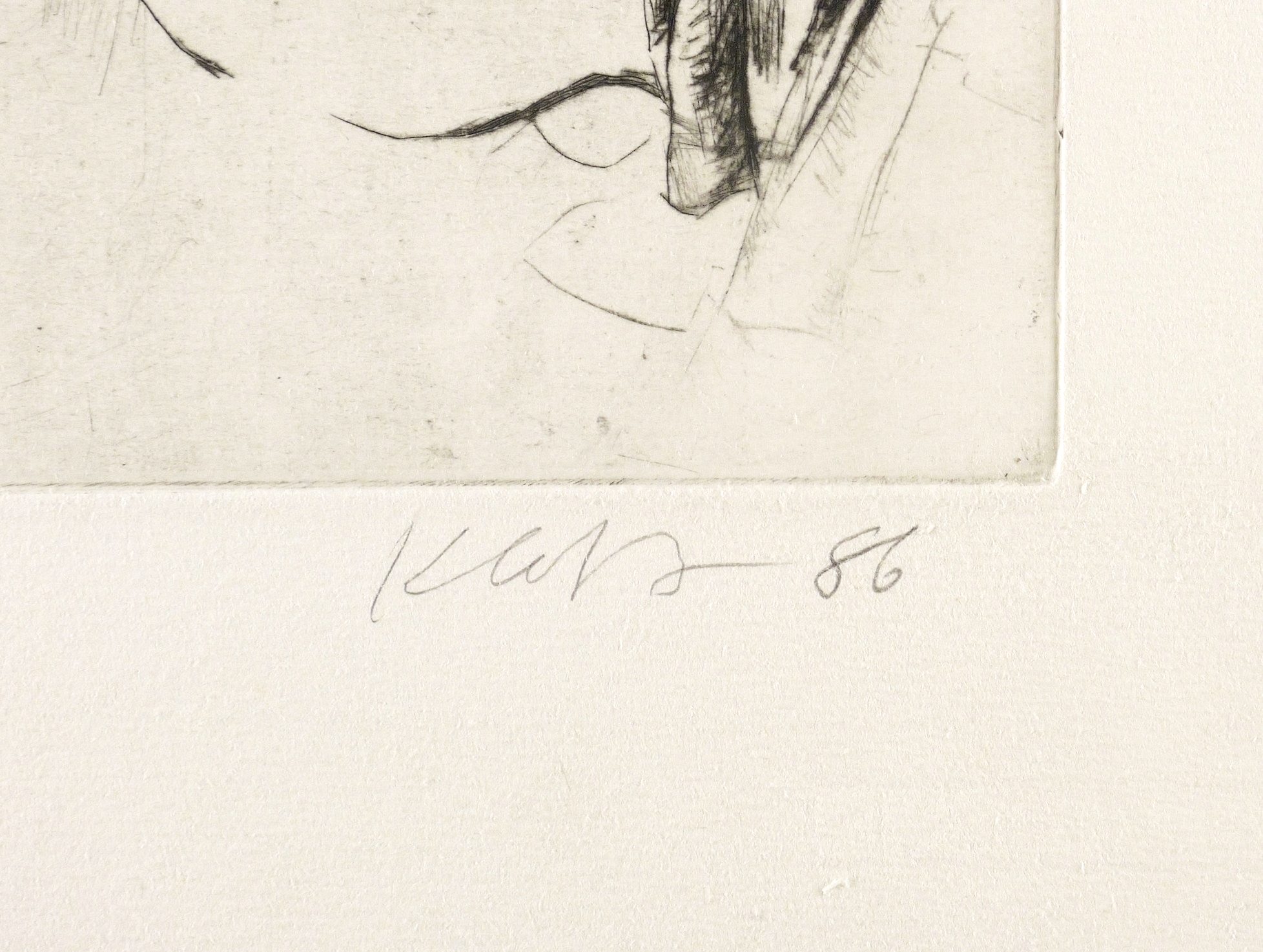 Rechts unten in Blesitift signiert und datiert: ″Klotz 86″. Links Auflagenbezeichnung: ″6/10″. Trockenstempel des Tiefdruckers Heinz Sparwart. Wasserzeichen der Hahnemühle. – Exemplar der zweiten Auflage dieser Radierung aus dem Jahr 1986. – Sehr guter Zustand.