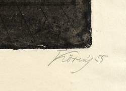 1955. Radierung / Aquatinta, in Schwarz, auf gelbem Büttenkarton. – Originale Künstlergrafik, von Hans Körnig. – Auflage Exemplar Nr. 167/1. – 32,2 x 32,5 cm (Darstellung / Platte), 60 x 41 cm (Blatt).