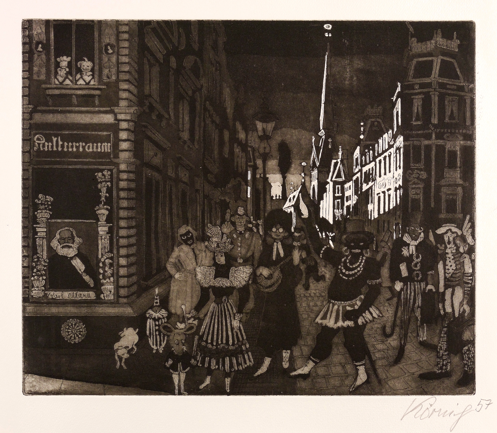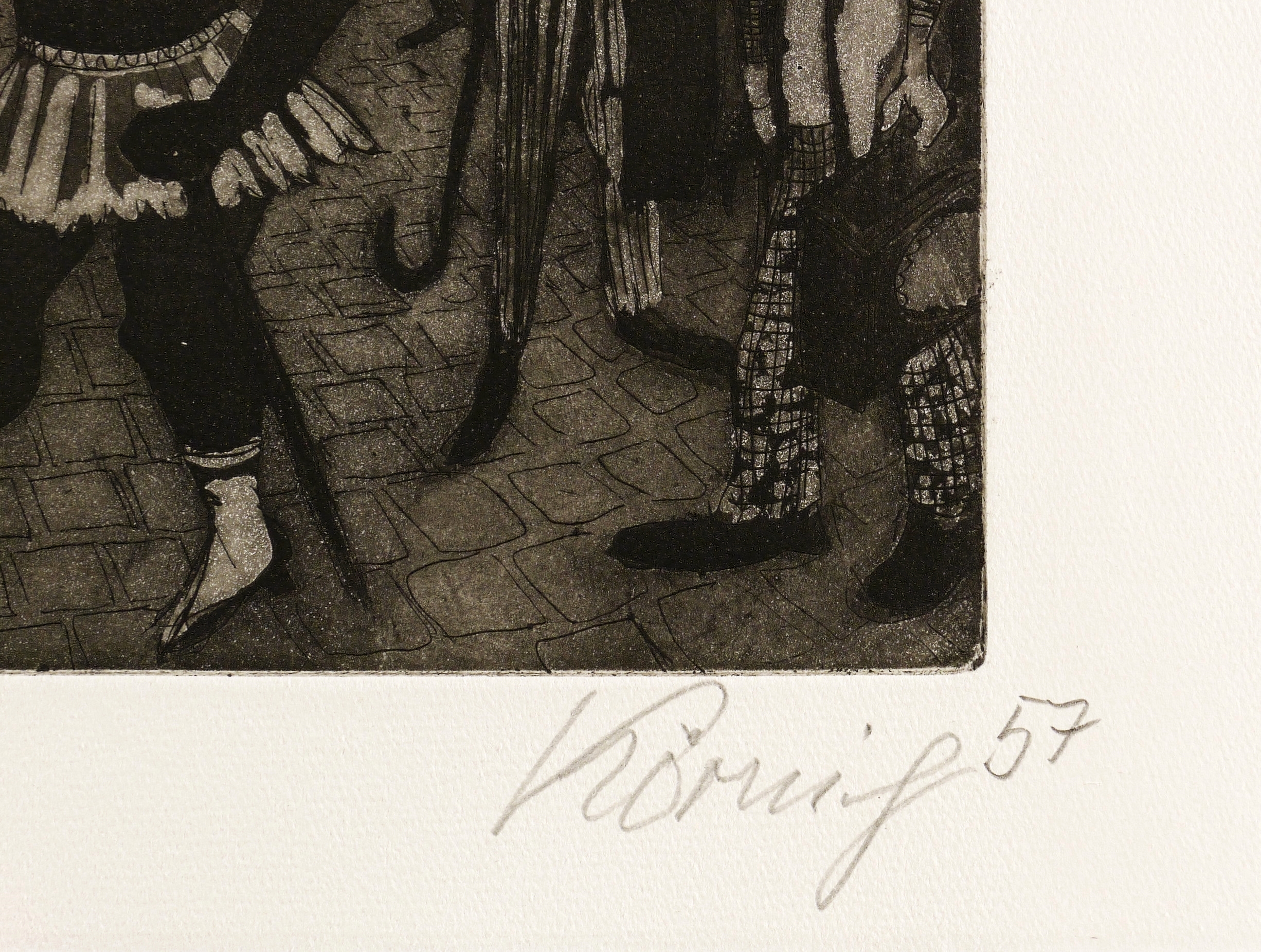 WVZ 195. – Rechts unten in Bleistift signiert und datiert: ″Körnig 57″. Verso Auflagenbezeichnung und WVZ-Nr. – Für die Mappe ″Fastnachtsspuk im Wallgäßchen″ (Dresden: eikon Grafik Presse 1988) gedruckt. – Sehr gut erhalten.