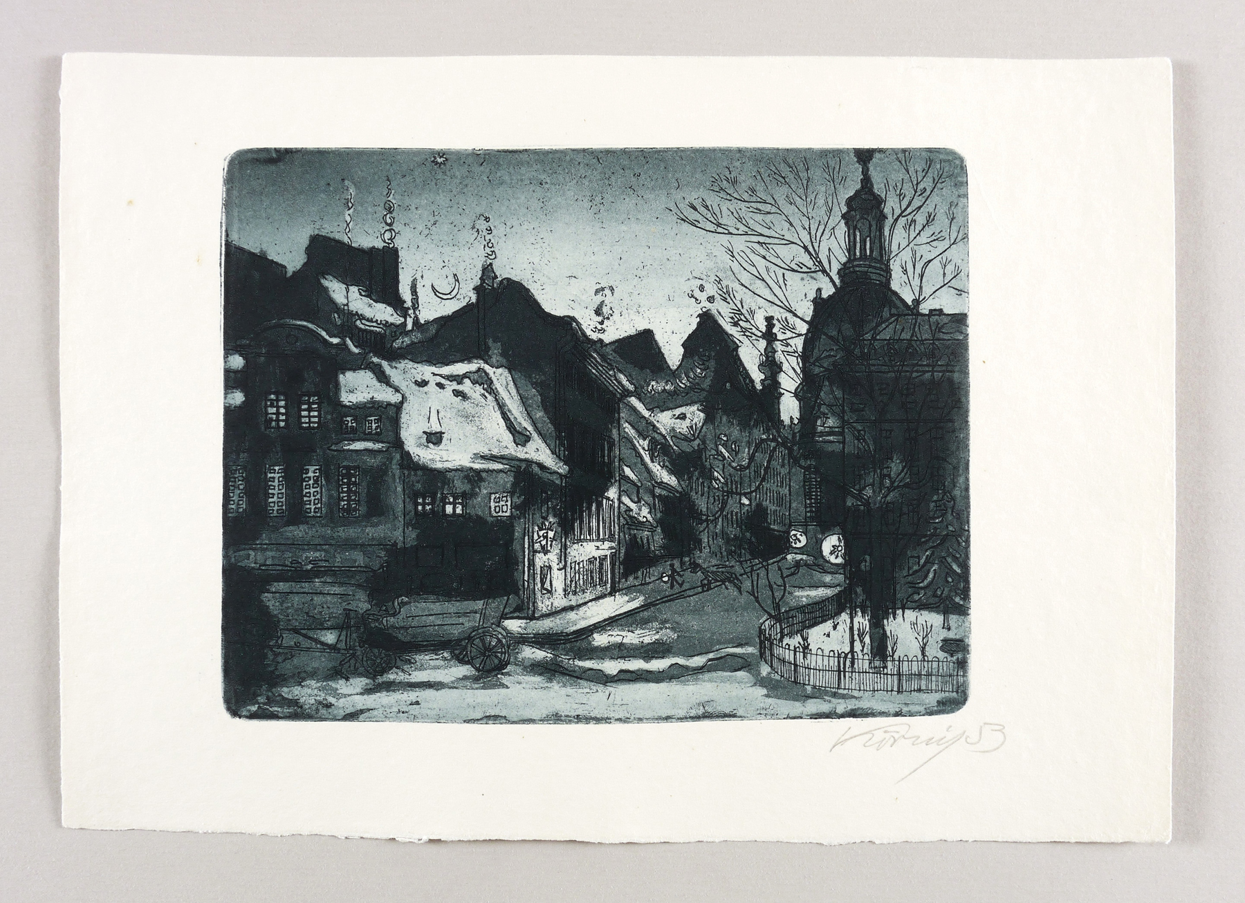 1953. Radierung / Aquatinta, mit Plattenton, in Schwarzblau, auf Kupferdruckpapier. – Originale Künstlergrafik, von Hans Körnig. – 15,7 x 20,3 cm (Darstellung / Platte), 22 x 31 cm (Blatt).