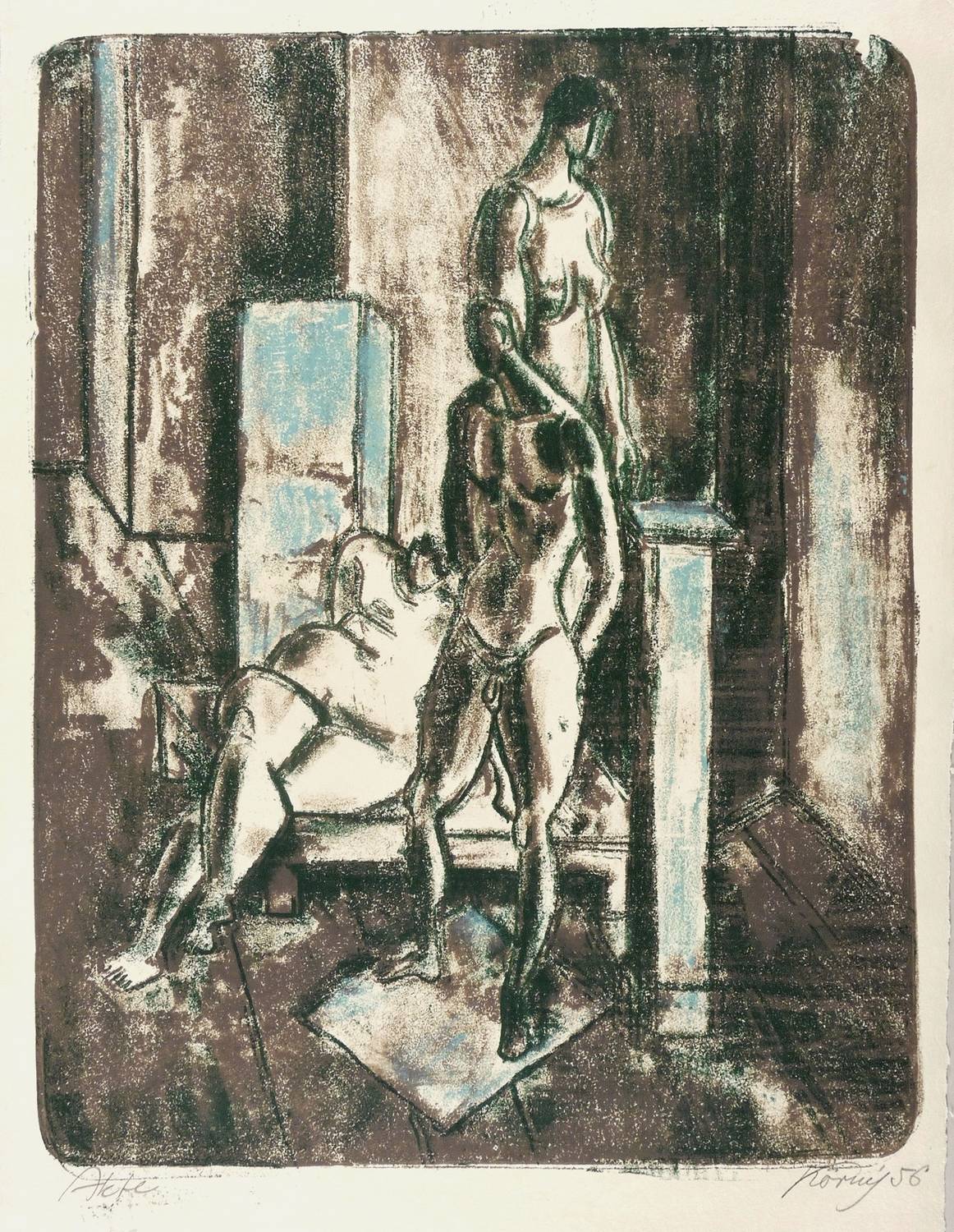1956. Farblithografie / Kreidelithografie, in Hellblau, Violettbraun & Schwarz, auf hellchamois Kupferdruckkarton. – Originale Künstlergrafik, von Hans Körnig. – 49,5 x 39,0 cm (Darstellung / Druckbild), 61 x 42 cm (Blatt).
