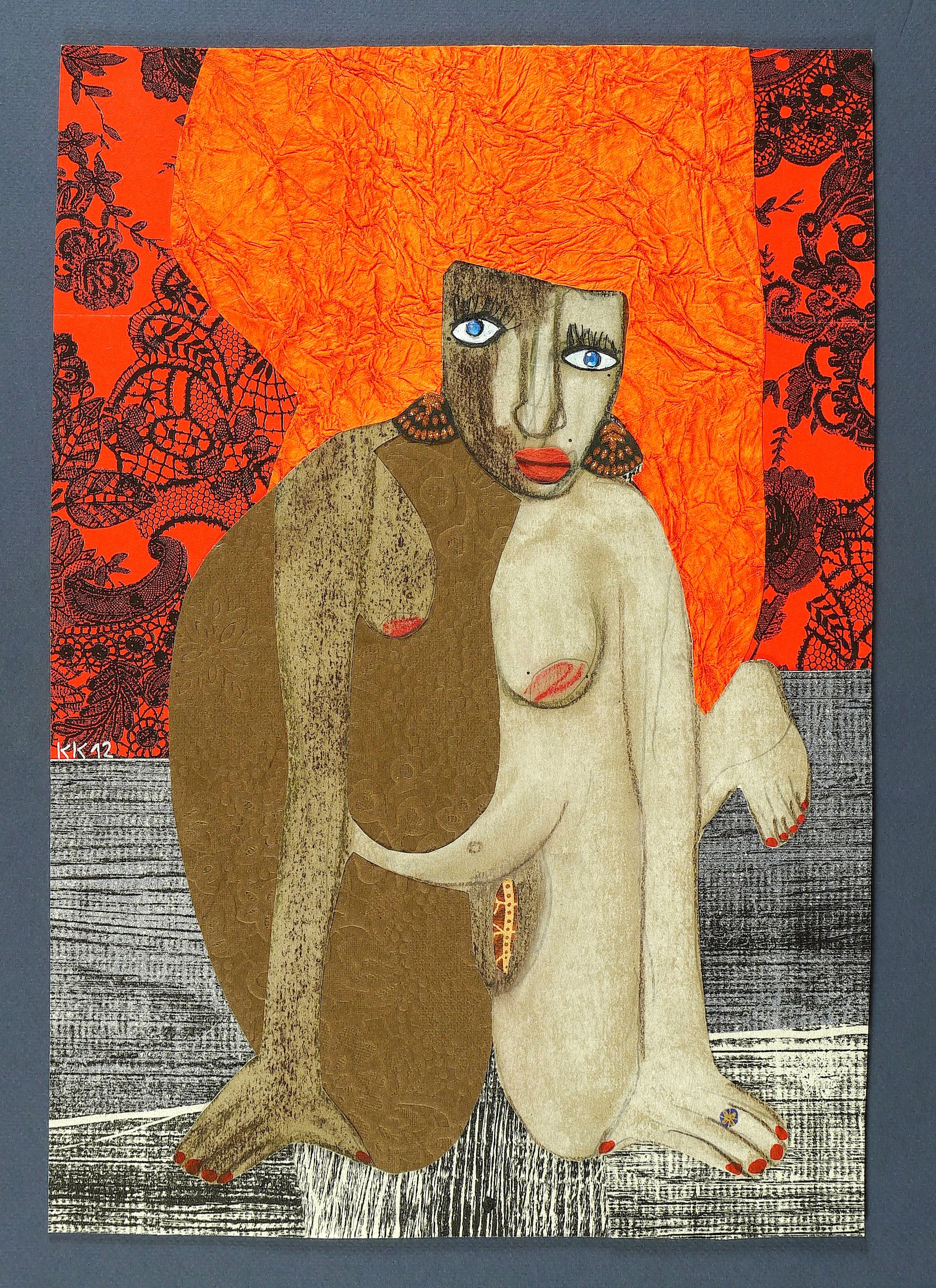 2012. Collage / Mischtechnik, Zeichnung, Holzschnitt & Dekorpapier. – Originale Künstlergrafik, von Katharina Kretschmer. – Unikat. – 42,0 x 29,0 cm (Darstellung / Blatt).