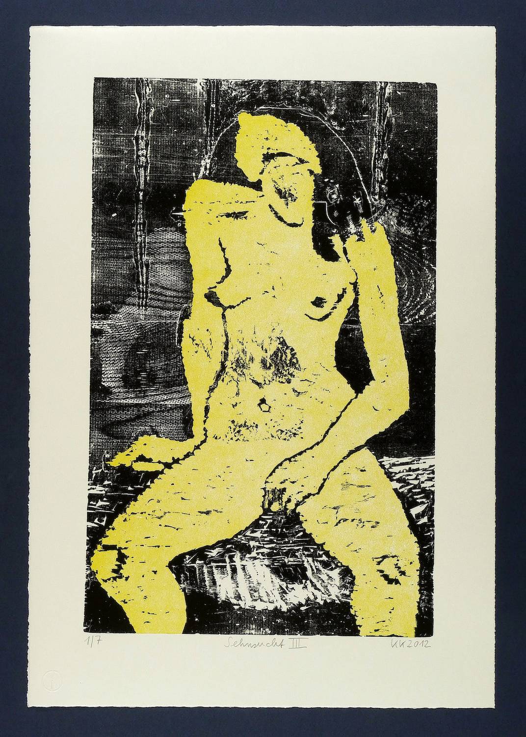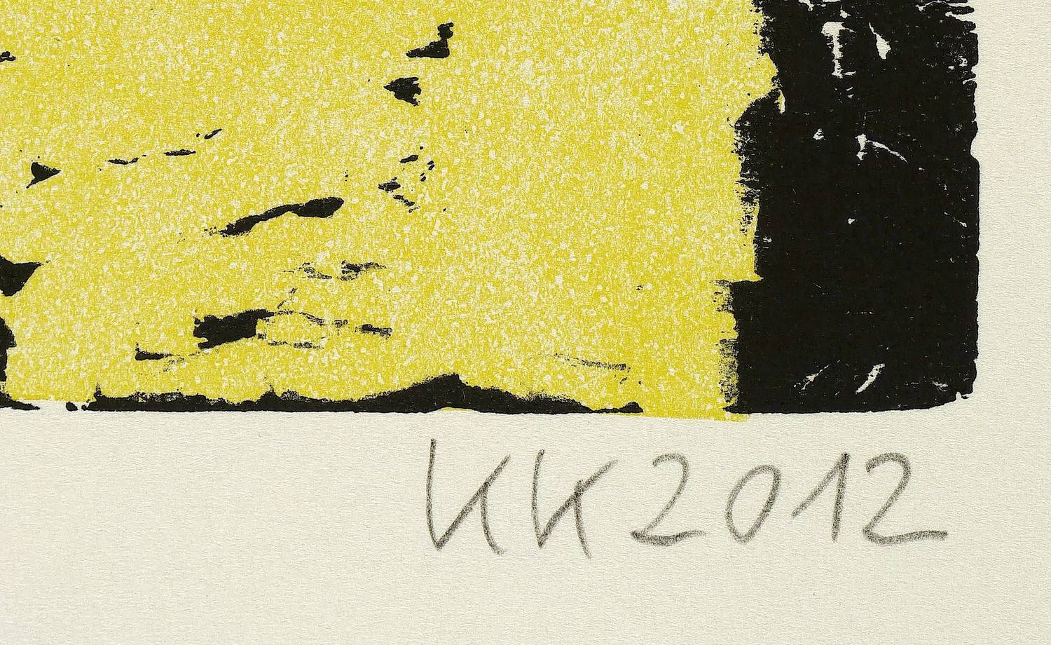 2012. Farbholzschnitt, in zwei Farben, auf Büttenpapier. – Originale Künstlergrafik, von Katharina Kretschmer. – Auflage Exemplar Nr. 1/7. – 50,6 x 31,7 cm (Darstellung / Druckstock), 62 x 42 cm (-).
