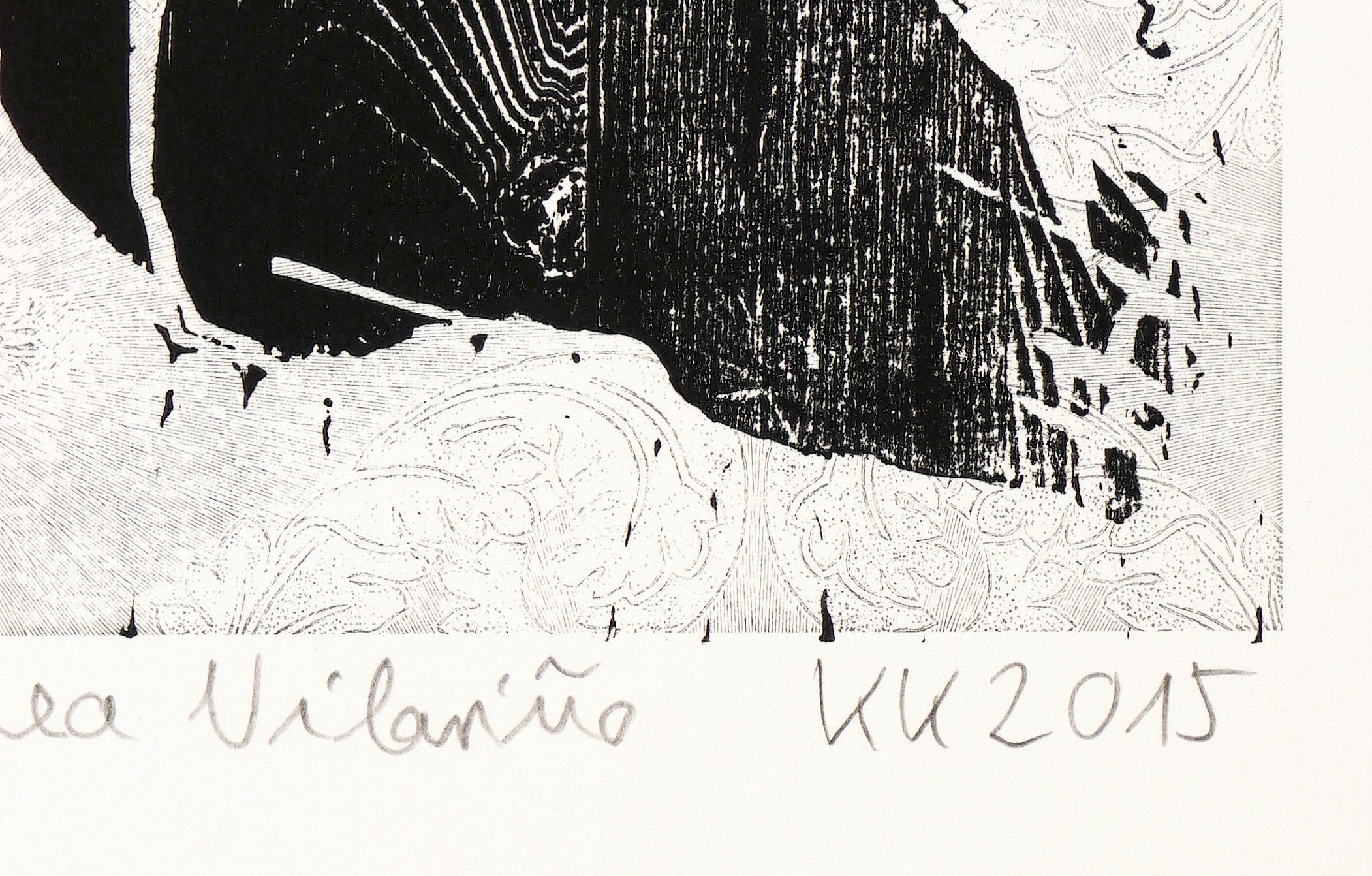 2015. Farbholzschnitt, mit Materialdruck, in 2 Farben, auf Velin. – Originale Künstlergrafik, von Katharina Kretschmer. – Auflage Exemplar Nr. 1/7. – 75,8 x 28,6 cm (Darstellung / Druckstock), 89,3 x 45,0 cm (Blatt).