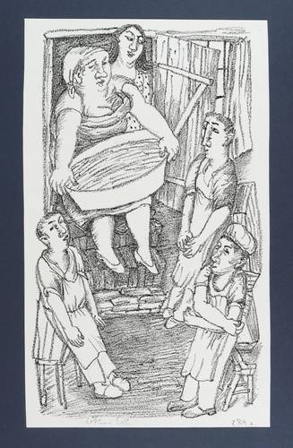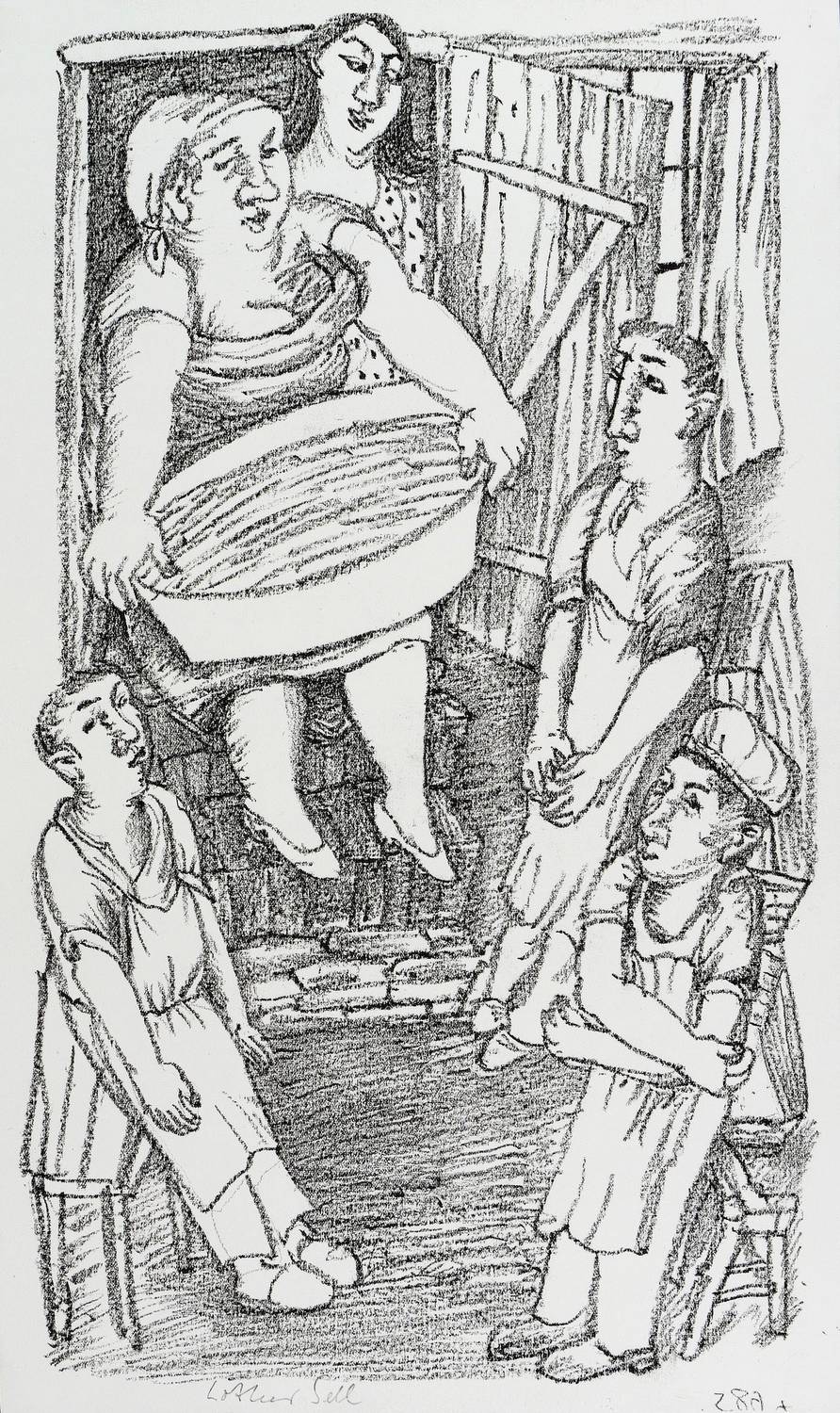 Lothar Sell (1939 Teuenbrietzen - 2009 Meißen). Deutscher Grafiker, Illustrator und Keramiker. 1957-63 Studium an der Hochschule für Bildende Künste Dresden (HfBK), bei Hans Theo Richter und Max Schwimmer. 1966-69 Meisterschüler an der Akademie der Künste Berlin (AdK). 1974-88 Lehrauftrag an der Burg Giebichenstein Hochschule für Kunst und Design in Halle. Mitglied im Verband Bildender Künstler der DDR. Seine Grafiken und Plastiken sind oft geprägt von einem humorigen "bäuerlichen" Charakter. Stilistisch dominiert deshalb eine oft derbe, zumeist auch naive Anmutung. 1976 Illustrationen zu Erwin Strittmatters "Ochsenkutscher". Die Leibesfülle, typisch für Sells Darstellung des menschlichen Körpers, charakterisiert u.a. die Keramiken des Brunnen im Meißner Zollhof.