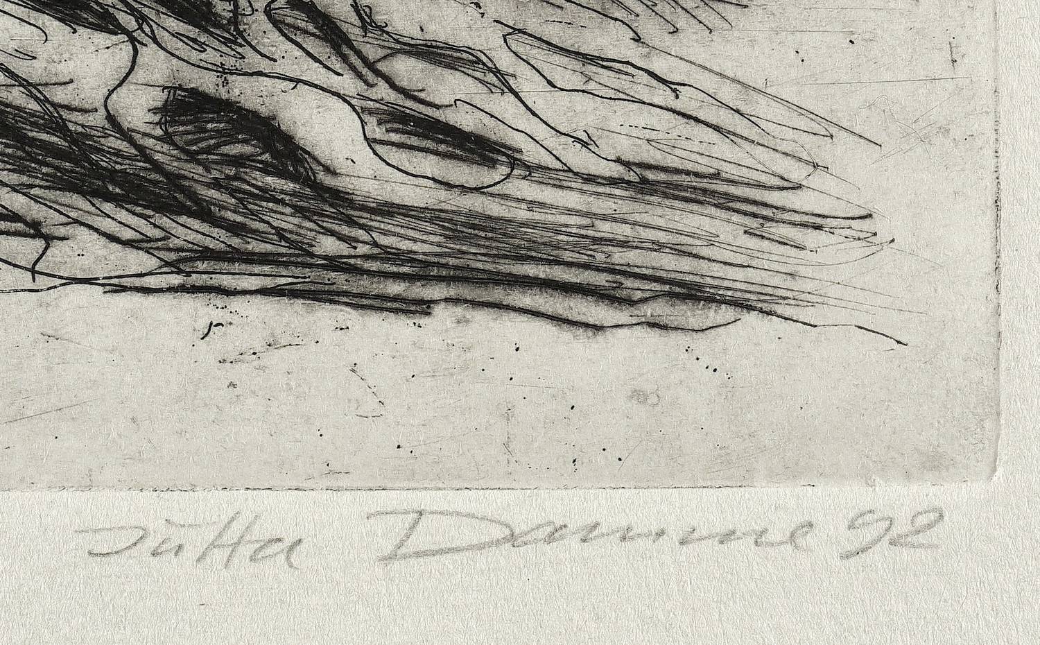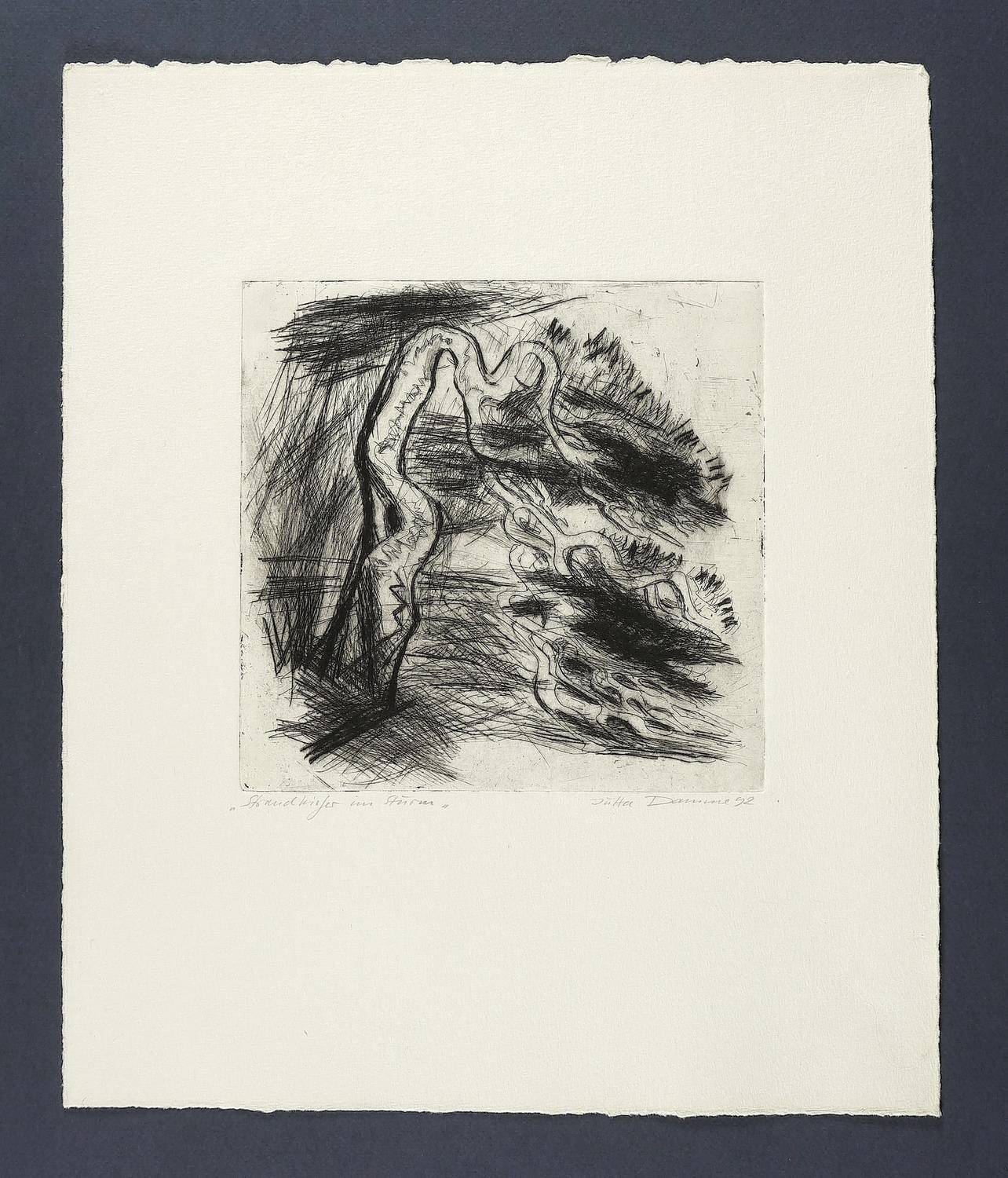 1992. Radierung / Strichätzung & Kaltnadel, in Schwarz, auf hellchamois Velin. – Originale Künstlergrafik, von Jutta Damme. – 19,1 x 19,7 cm (Darstellung / Platte), 39,5 x 33 cm (Blatt).