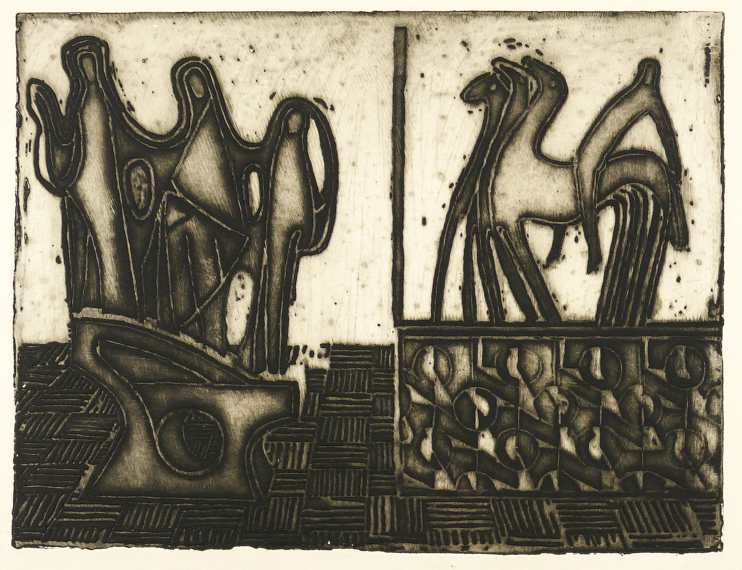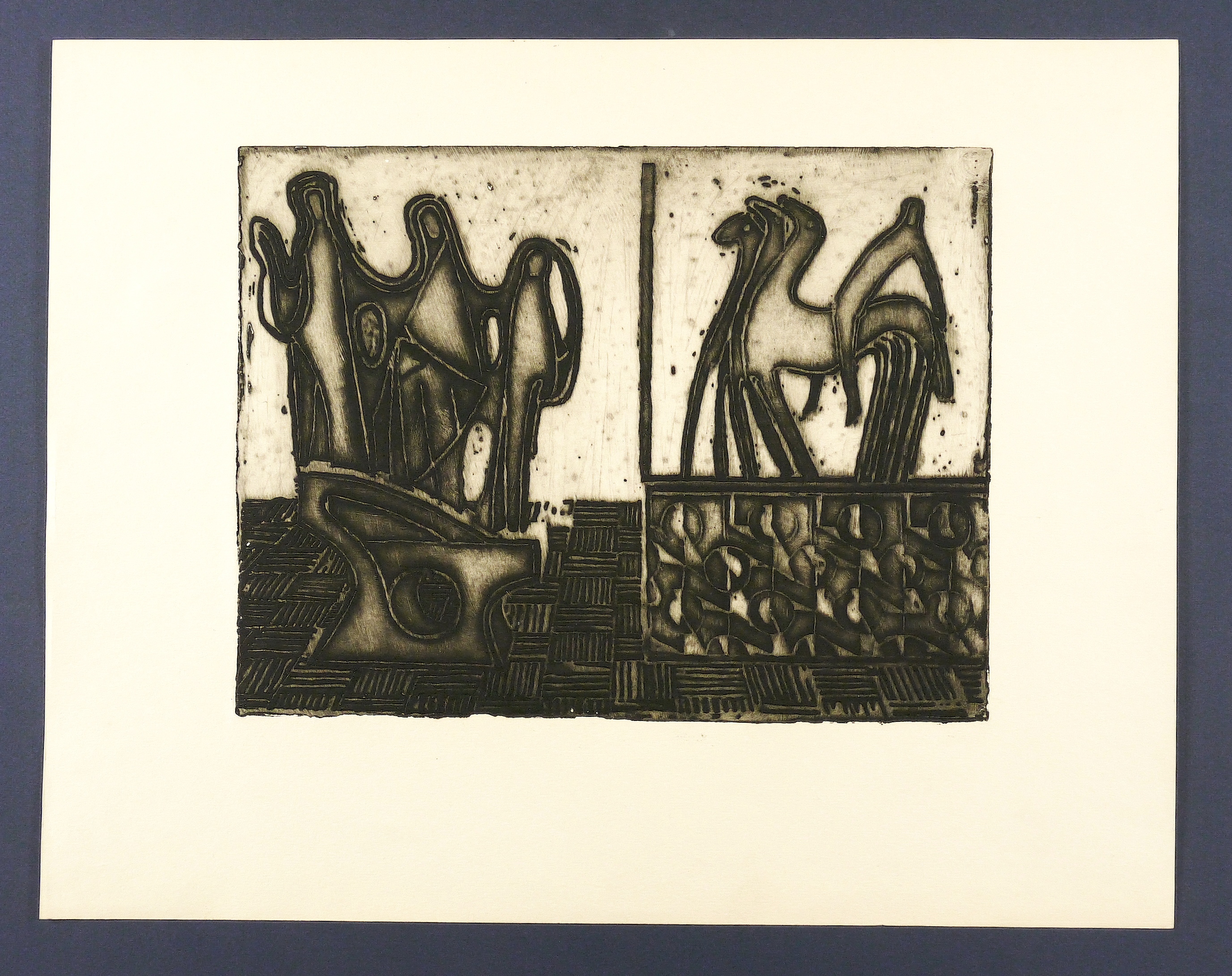 Um 1960. Radierung / Strichätzung, mit Prägung, partiell geschliffen, in Schwarzbraun, auf Velin. – Originale Künstlergrafik, von Max Lachnit. – 24,3 x 32,0 cm (Darstellung / Platte), 38 x 48 cm (Blatt).
