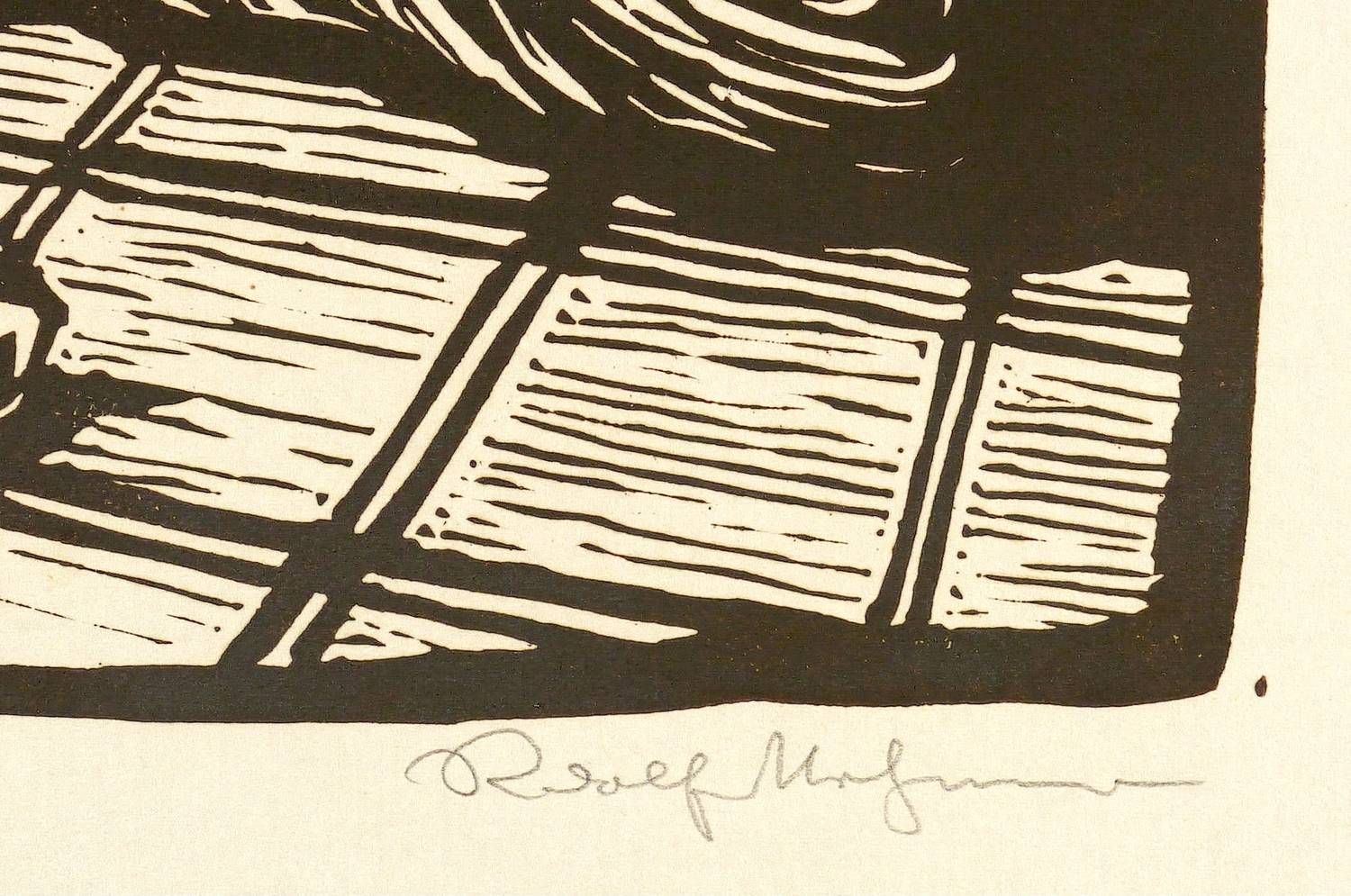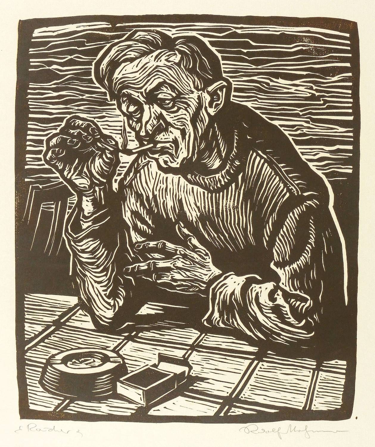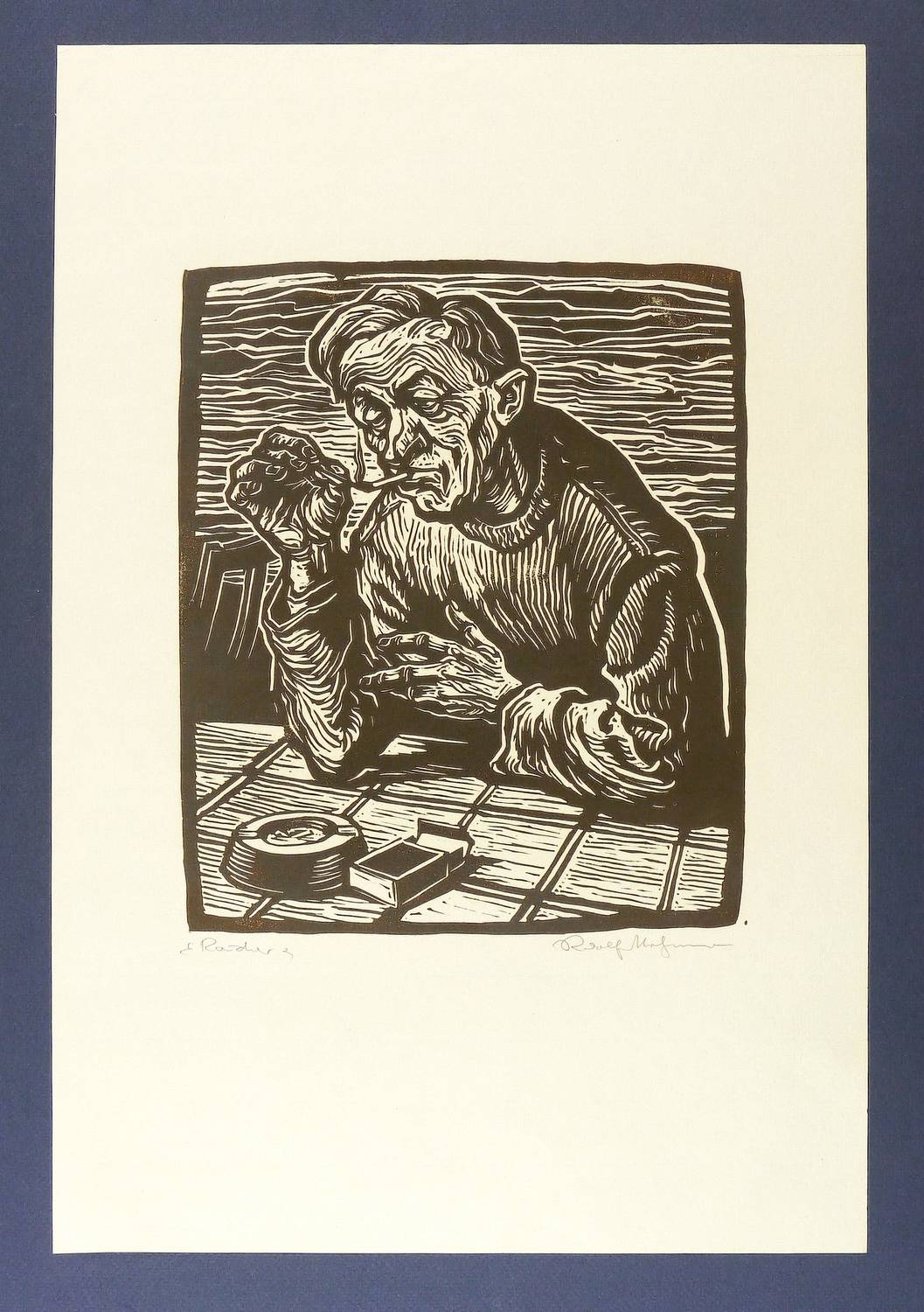 Um 1960. Holzschnitt, in Schwarzbraun, auf gelbem Maschinenbütten. – Originale Künstlergrafik, von Rudolf Nehmer. – 25,9 x 21,8 cm (Darstellung / Druckbild), 47 x 32 cm (Blatt).