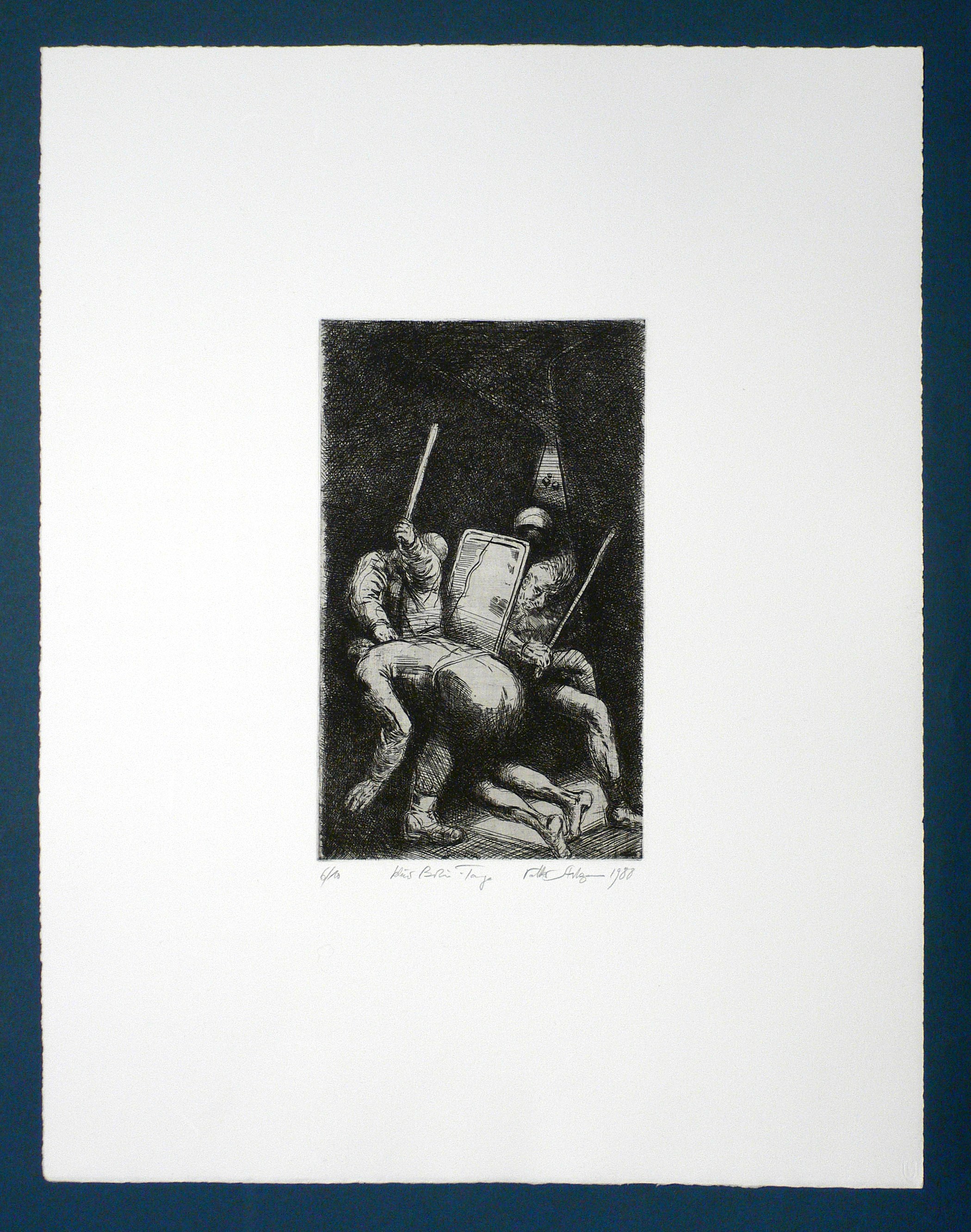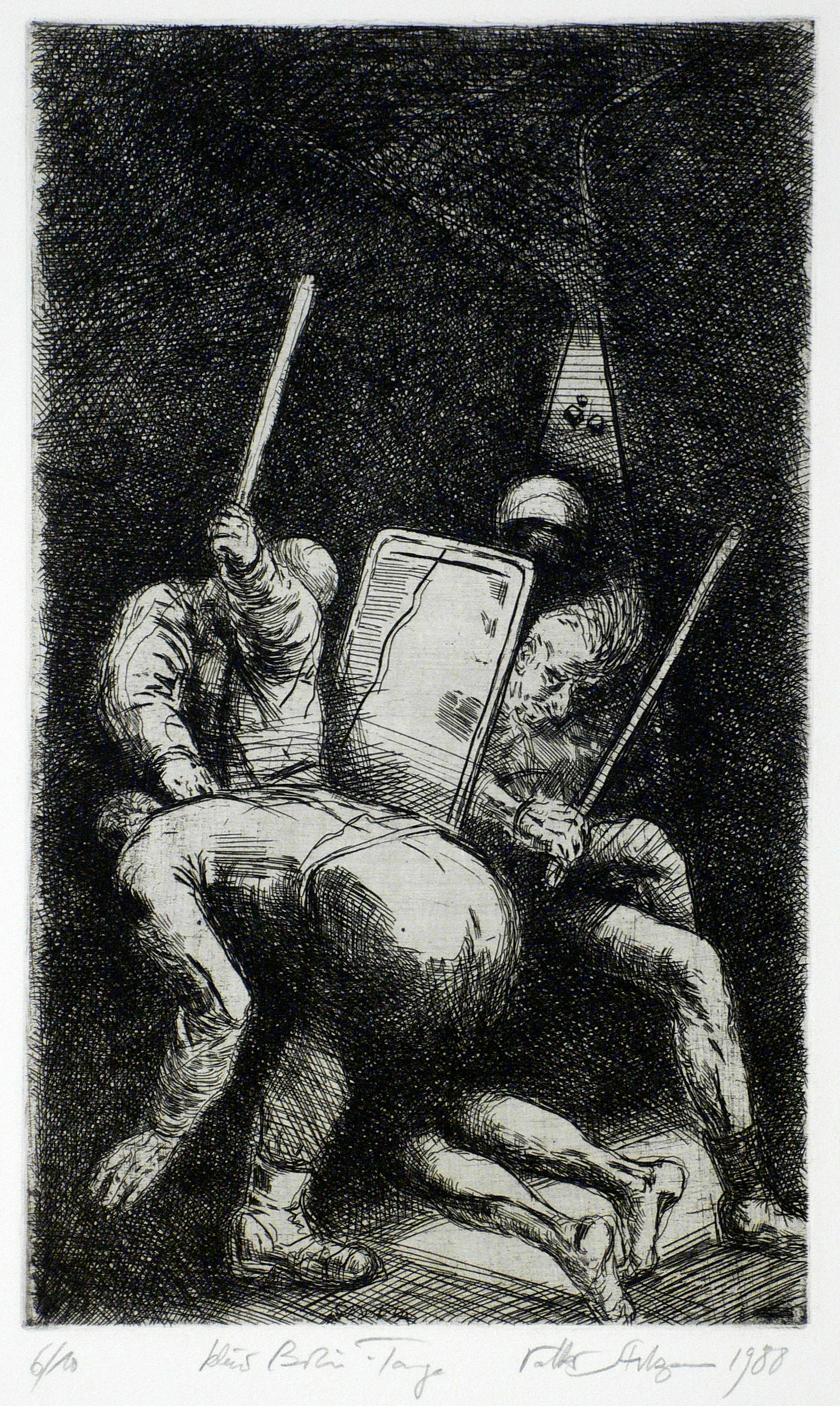 1988. Radierung / Strichätzung, in Schwarz, mit Plattenton, auf hellchamois Velin. – Originale Künstlergrafik, von Volker Stelzmann. – Auflage Exemplar Nr. 6/10. – 24,7 x 14,9 cm (Darstellung / Platte), 52 x 40,5 cm (Blatt).