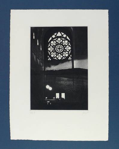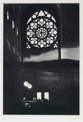 Rechts unter der Platte in Bleistift signiert und datiert und links betitelt. – Montage fotografischer Aufnahmen des Inneren einer Kirche mit dem Blick über die Moldau auf einen Hügel. - Sehr stimmungsvolles charakteristisches Blatt. – Papier leicht gebräunt. Sonst sehr gut erhalten.