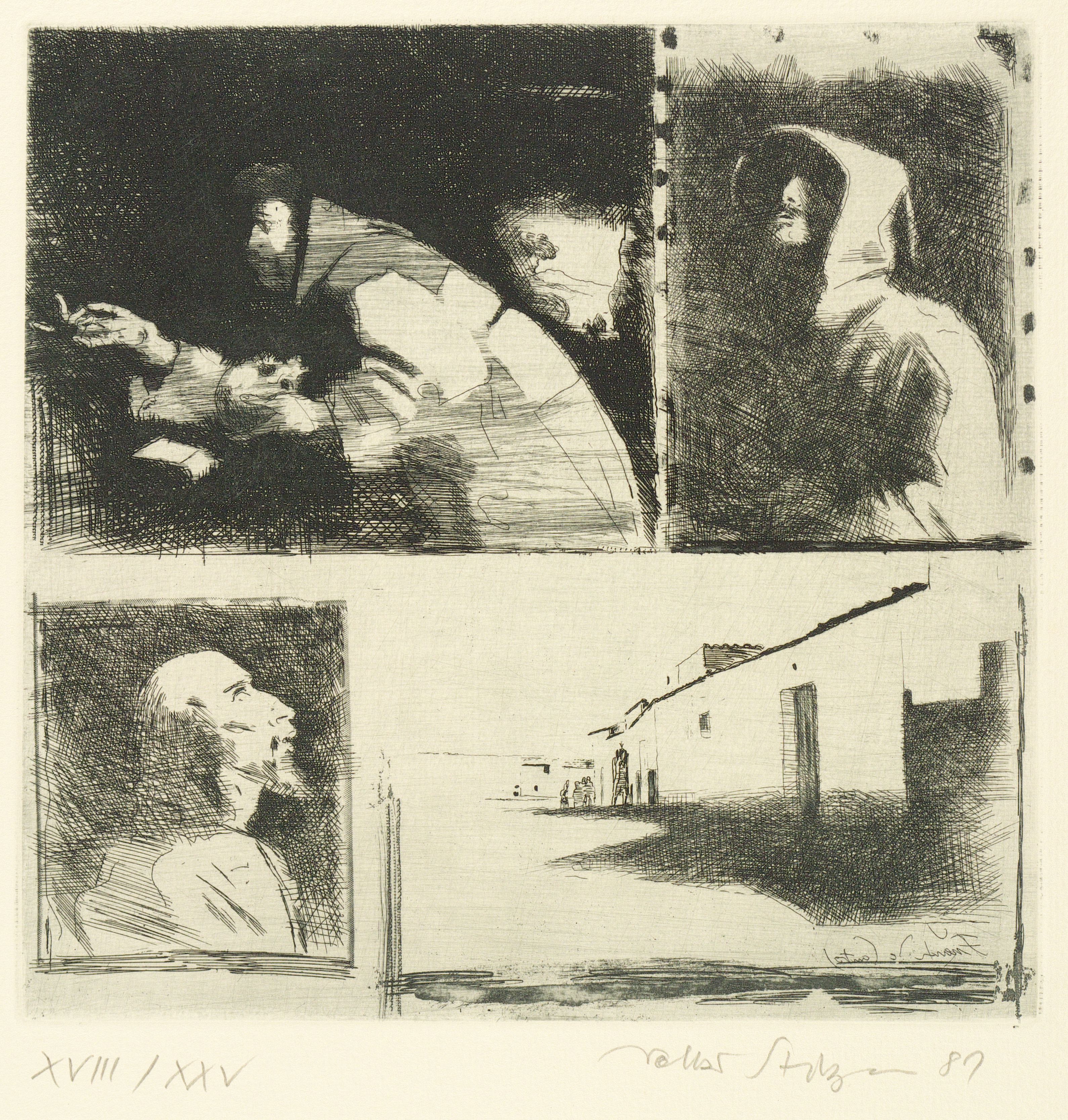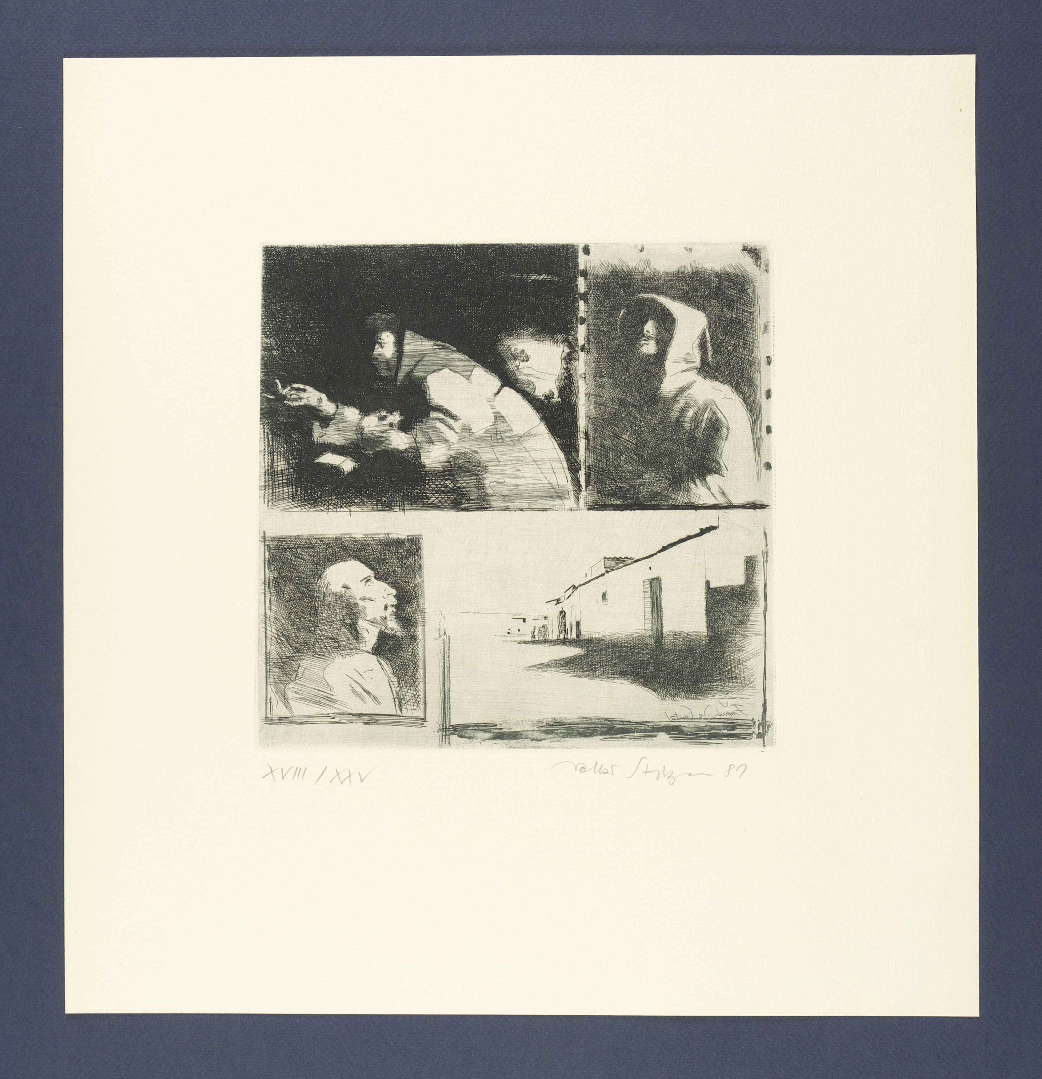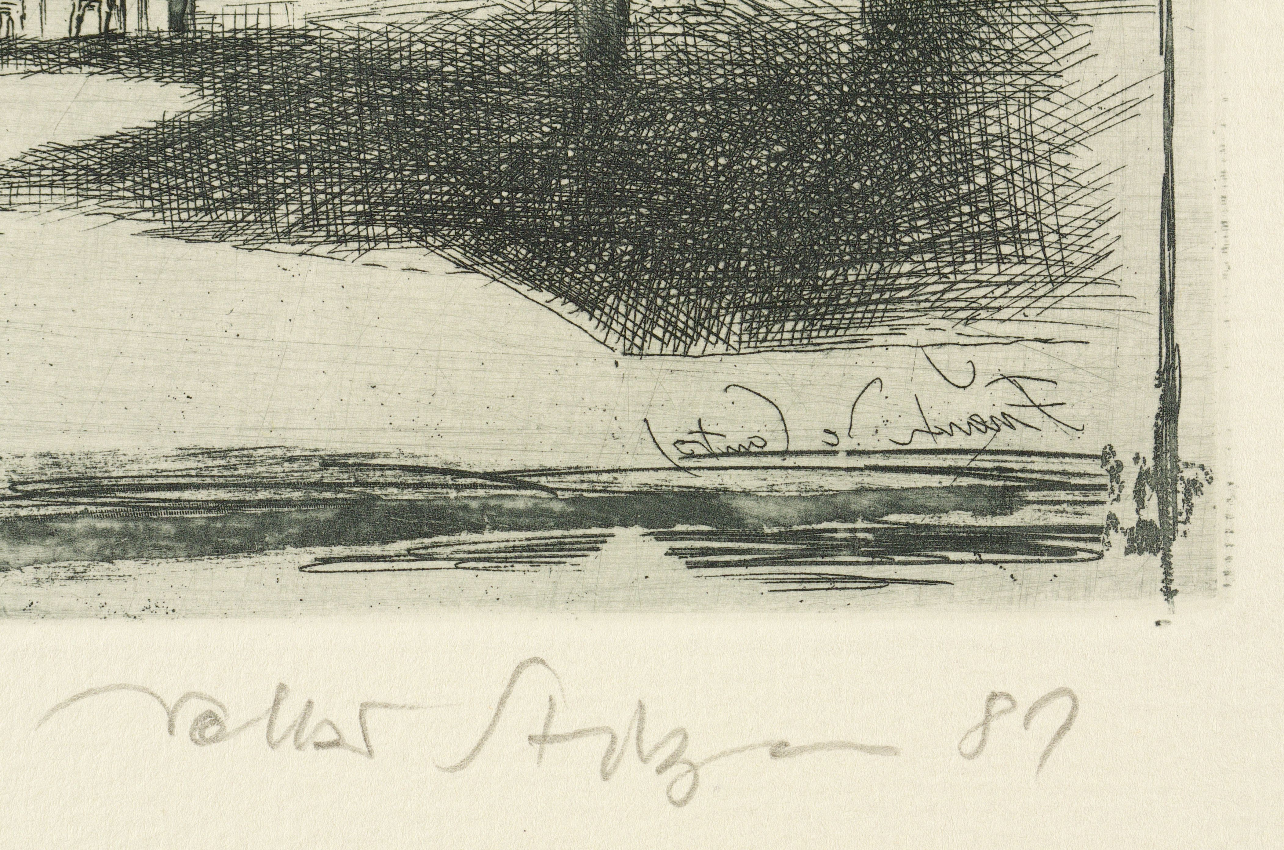 1981. Radierung / Strichätzung, in Schwarz, mit Plattenton, auf hellchamois Velin. – Originale Künstlergrafik, von Volker Stelzmann. – Auflage Exemplar Nr. 23/25. – 19,5 x 20,0 cm (Darstellung / Platte), 37 x 35 cm (Blatt).