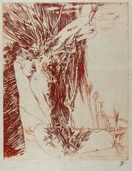 1985. Radierung / Strichätzung, in Rotbraun, auf hellgelbem Japan. – Originale Künstlergrafik, von Horst Janssen. – 27,4 x 21,9 cm (Darstellung / Platte), 34,0 x 23,5 cm (Blatt).