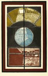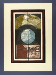 1978. Farbradierung / Farbaquatinta & Siebdruck, in 5 Farben, auf Velinkarton. – Originale Künstlergrafik, von Eckard Robert Schwandt. – Auflage Exemplar Nr. 42/100. – 47,0 x 30,4 cm (Darstellung / Druckstock), 60 x 42 cm (Blatt).