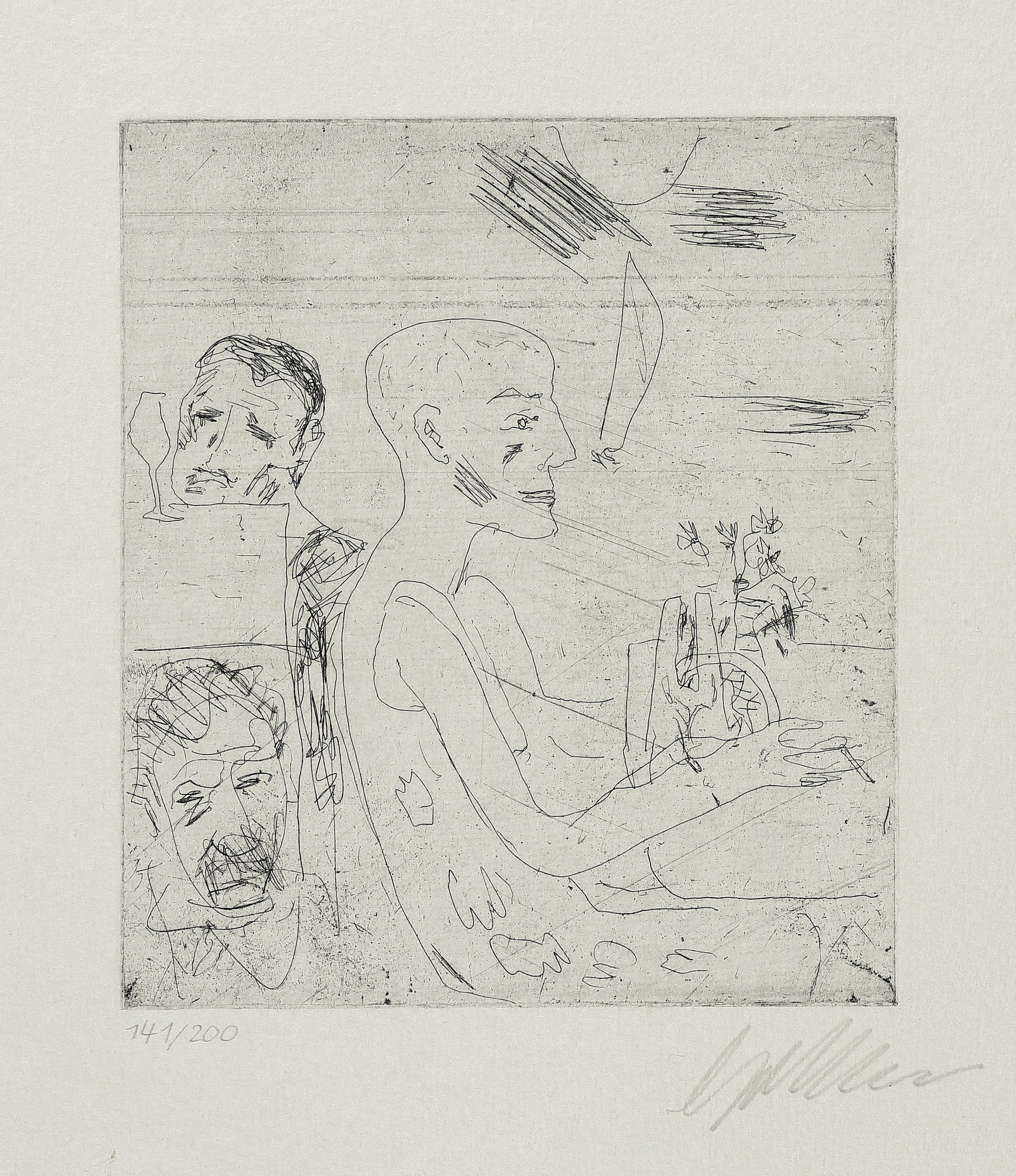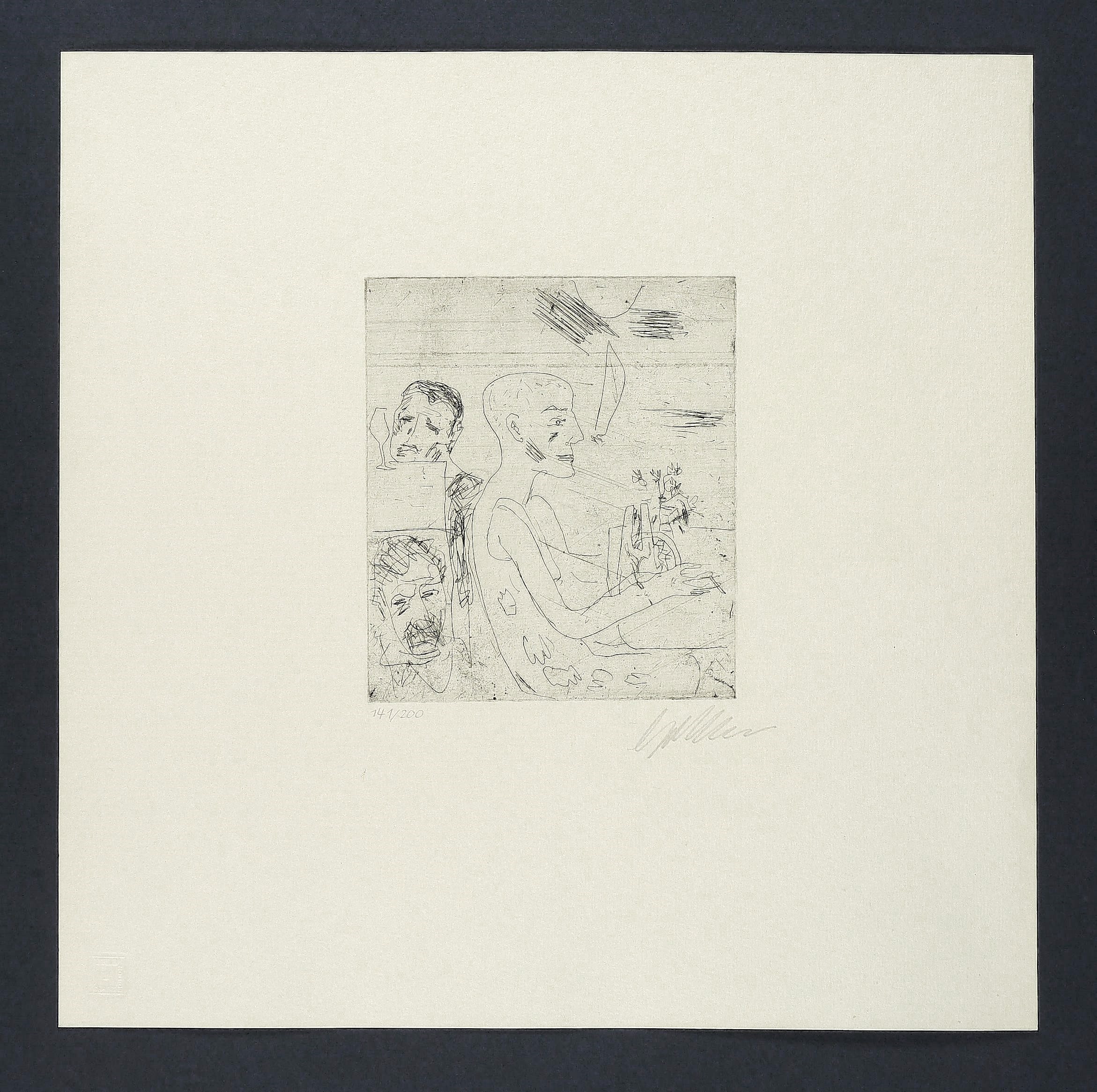 1988. Radierung / Strichätzung, in Schwarz, mit Plattenton, auf Büttenpapier. – Originale Künstlergrafik, von Dieter Goltzsche. – Auflage Exemplar Nr. 141/200. – 15,5 x 13,5 cm (Darstellung), 36 x 36 cm (Blatt).
