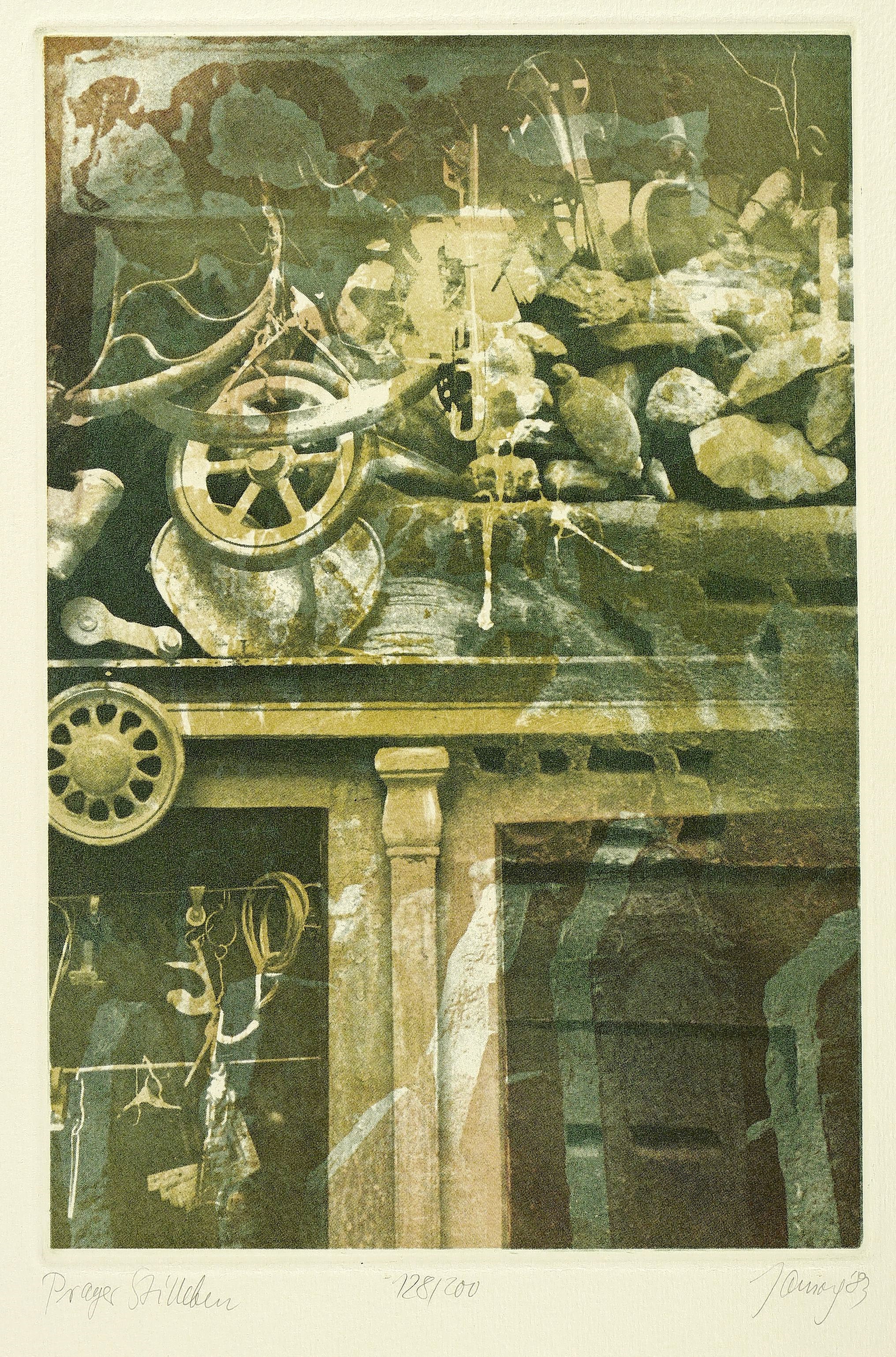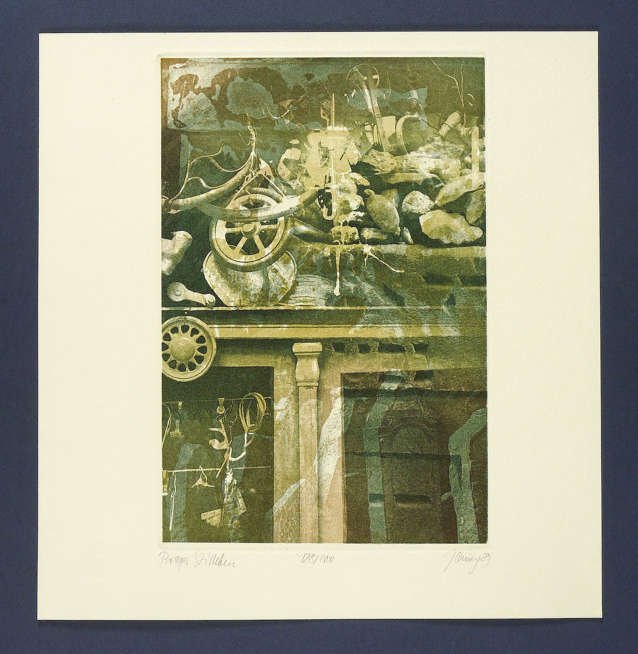 1983. Farbradierung / Rasterätzung, nach Fotomontage, in 2 Farben. – Originale Künstlergrafik, von Joachim Jansong. – Auflage Exemplar Nr. 128/200. – 30,2 x 20,1 cm (Darstellung), 31,0 x 20,5 cm (Platte), 37 x 35 cm (Blatt).