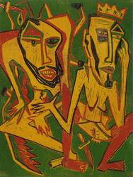 1989. Farbholzschnitt, in Orange, Rotbraun, Grün & Schwarz, auf Karton. – Originale Künstlergrafik, von Klaus Süß. – Auflage Exemplar Nr. 17/25. – 40,5 x 30,5 cm (Darstellung / Blatt).