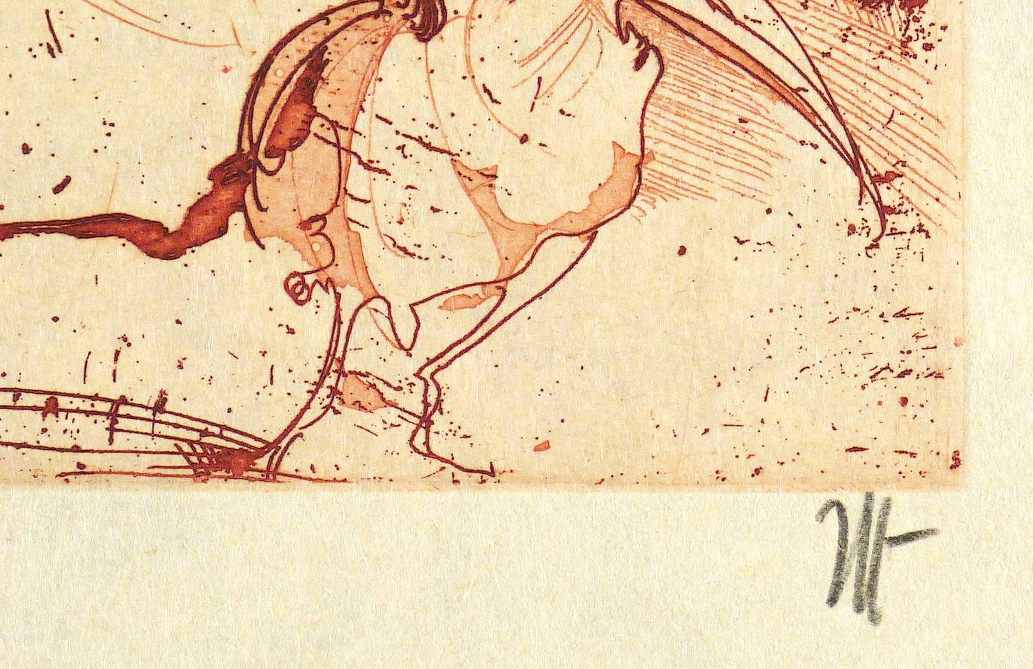1988. Radierung / Strichätzung & Aquatinta, in Sepia, auf gelblichem Bütten. – Originale Künstlergrafik, von Horst Janssen. – 29,4 x 20,7 cm (Darstellung / Platte), 44 x 32,5 cm (Blatt).