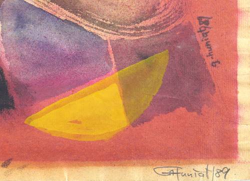 1989. Mischtechnik / Aquarell, Gouache & Tusche, auf orangem Büttenpapier. – Originale Künstlergrafik, von Günther Huniat. – Unikat. – 61,0 x 47,3 cm (Darstellung), 63 x 48,5 cm (Blatt).