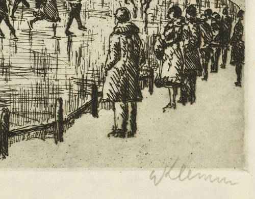 Walther Klemm (1885 Karlsbad – 1957 Weimar). Deutscher Maler, Zeichner und Grafiker, wichtiger Vertreter der neueren Weimarer Malerschule. Der Ermunterung durch Emil Orlik folgend studierte Klemm an der Wiener Kunstgewerbeschule bei Anton von Kenner und Kolo Moser. Um 1903 entstanden unter dem Einfluss des Japonismus erste Farbholzschnitte, in denen sich früh seine außerordentliche Begabung für die Tierdarstellung zeigte. In der Ausstellung der Wiener Sezession von 1904 verhalfen ihm diese Blätter zu unverhofftem Erfolg. Etwa zeitgleich gründete er in Prag eine Ateliergemeinschaft mit Carl Thiemann, mit dem er 1907 zur Künstlerkolonie Dachau überging. 1910 wurde er Mitglied der Berliner Sezession, dessen wohl bedeutendster Vertreter, Max Liebermann, dem noch jungen Künstler lakonisch prophezeit hatte: „Das wird was. Sie haben Talent“. 1913 erfolgte schließlich die Berufung als Professor an die Hochschule für Bildende Kunst in Weimar. Hier entfaltete Klemm einen überreichen Kosmos an Tier-, Figuren- und Landschaftsdarstellungen, entstand eine große Anzahl von Illustrationen und grafischen Folgen. Fruchtbare Beziehungen unterhielt er zu Harry Graf Kessler, Theodor von Hagen, Fritz Mackensen, Alexander Olbricht und Ludwig von Hofmann. Nach dem Krieg verwendete sich Klemm nachhaltig für den Wiederaufbau der Kunsthochschule Weimar.