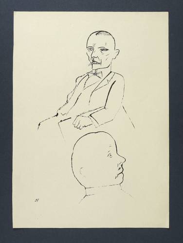 George Grosz (1893 Berlin - 1959 Berlin). Deutsch-amerikanischer Maler, Grafiker und Karikaturist. Bekannt sind vor allem seine der Neuen Sachlichkeit zugerechneten, sozial- bzw. gesellschaftskritischen Gemälde und Zeichnungen. Typische Sujets sind die Großstadt, ihre Abseitigkeiten (Mord, Perversion und Gewalt) sowie die Klassengegensätze, die sich in ihr zeigen. In seinen Karikaturen verspottet er die herrschenden Kreise der Weimarer Republik, greift soziale Gegensätze auf und kritisiert insbesondere Wirtschaft, Politik, Militär und Klerus.