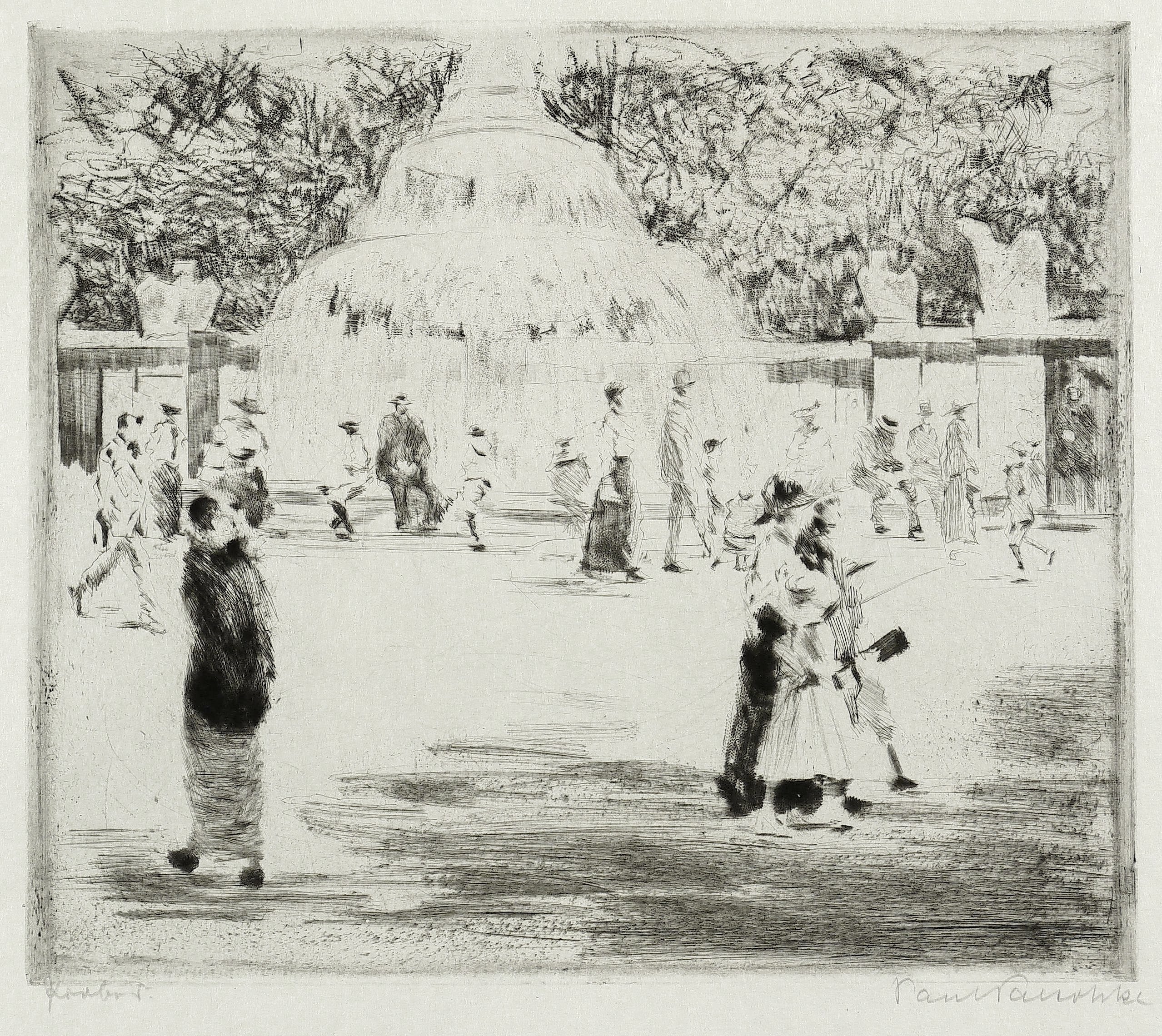 Paul Paeschke (1875 Berlin - 1943 Berlin). Deutscher Maler und Radierkünstler. 1900-06 Studium an der Kunstakademie in Berlin. Meisterschüler von Karl Köpping. Zu seinen Hauptmotiven zählten die belebten, innerstädtischen Straßen und Plätze Berlins und anderer europäischer Städte, die er gern lichtdurchflutet in einer impressionistischen Darstellungsweise wiedergab. Paeschke gilt als begnadeter Radierkünstler, der die diversen Techniken des Tiefdrucks von der Kaltnadel bis zum Roulette nahezu bis zur Perfektion trieb.