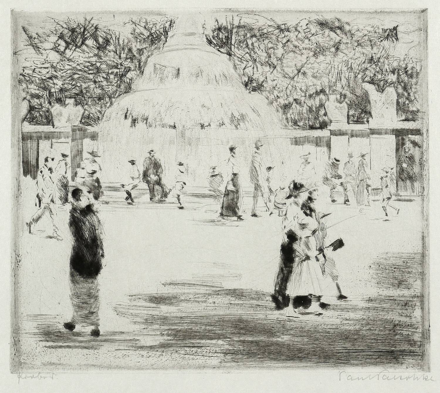 Kiewitz 933. – In Bleistift rechts unten signiert. Links bezeichnet: ″Probedr.″ – Seltener Probedruck. – Typische Flanierszene mit Spaziergängern am Marmorbrunnen vor dem Brandenburger Tor. – Tadellos erhalten.