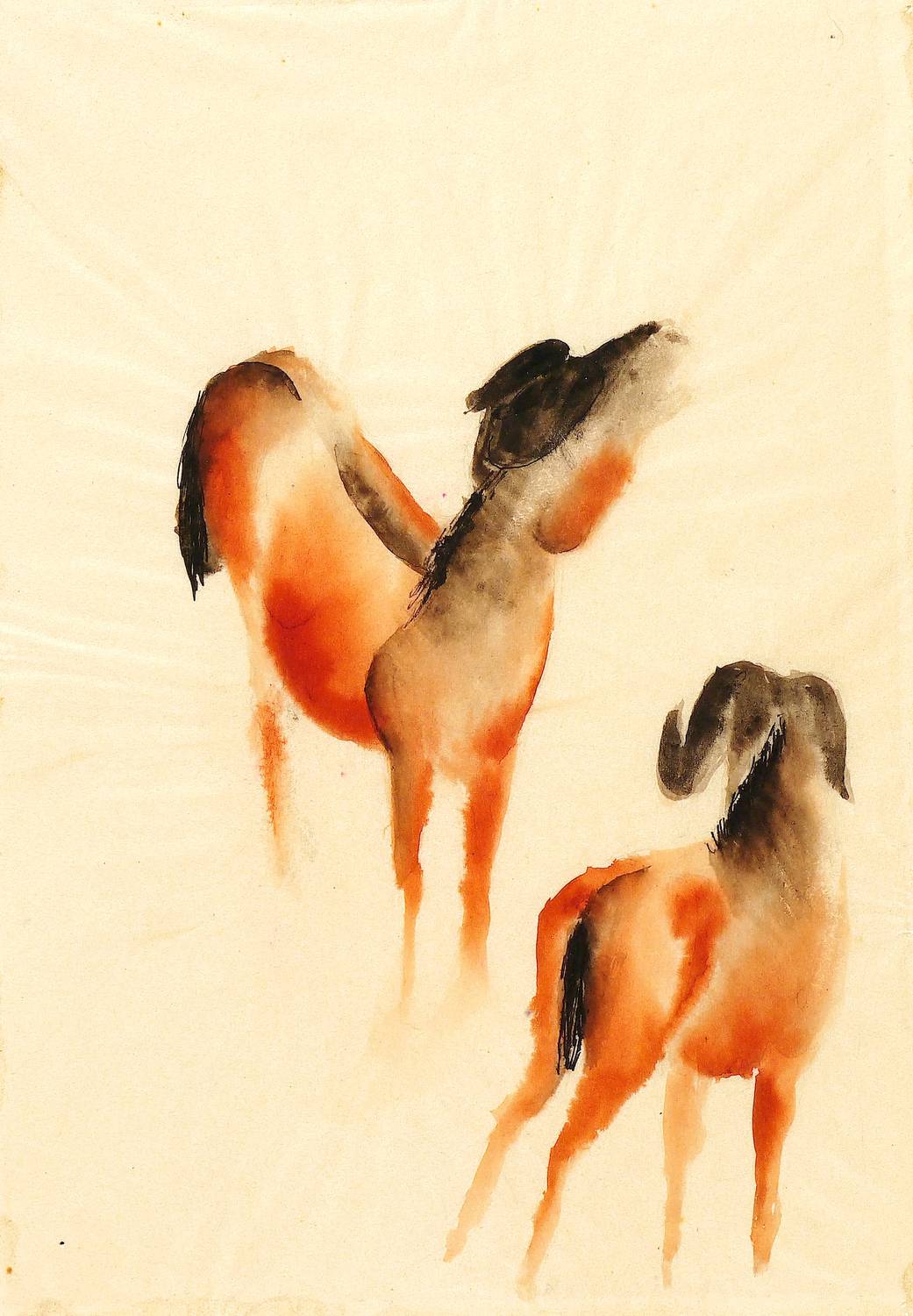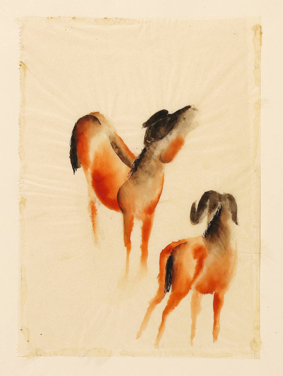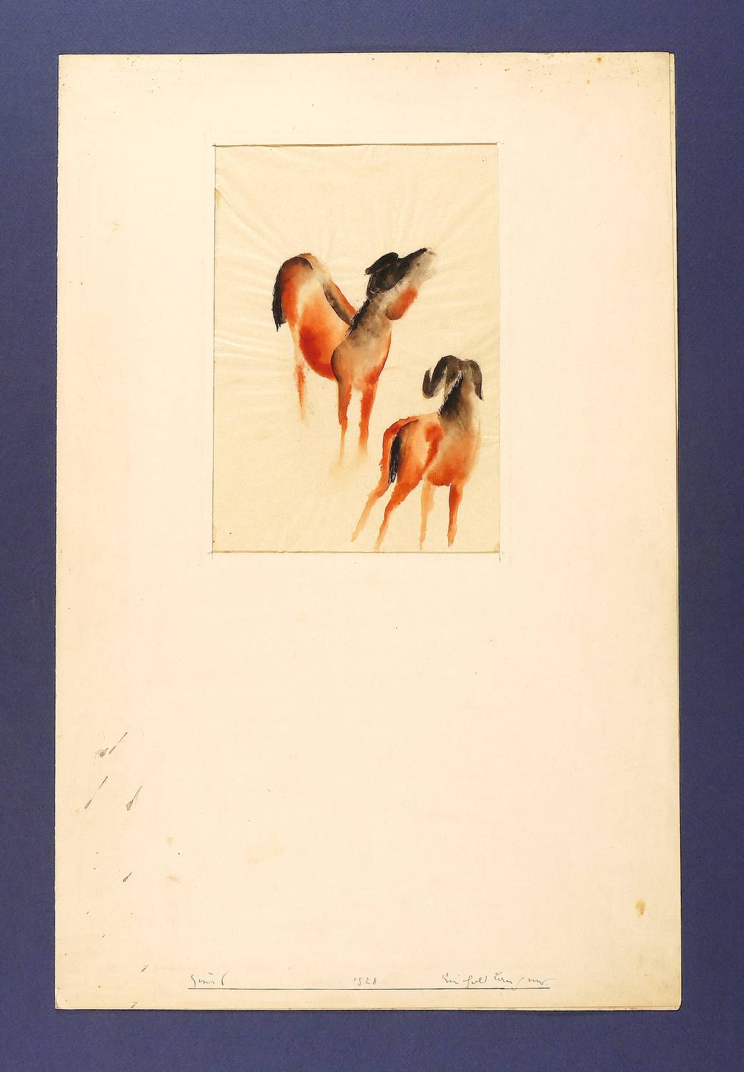 Auf dem Passepartout unten in schwarzer Feder betitelt, signiert und datiert: ″Gnus / 1928 / Reinhold Langner″. – Das feine Zeichenpapier vom Aquarellieren etwas gewellt. Original entlang der Blattränder in ein Passepartout geklebt. Das Blatt selbst von schöner frischer Wirkung. Das Passepartout außen etwas fleckig. Guter Gesamtzustand.