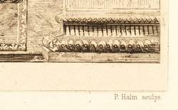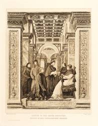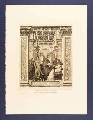 Nicht handsigniert. In der Platte rechts unten gestochene Signatur: ″P. Halm sculps.″ – Schöne grafische Wiedergabe des Freskogemäldes ″Sixtus IV. ernennt Platina zum Präfekten der Vatikanischen Bibliothek″ von 1477. – Tadellos erhalten.